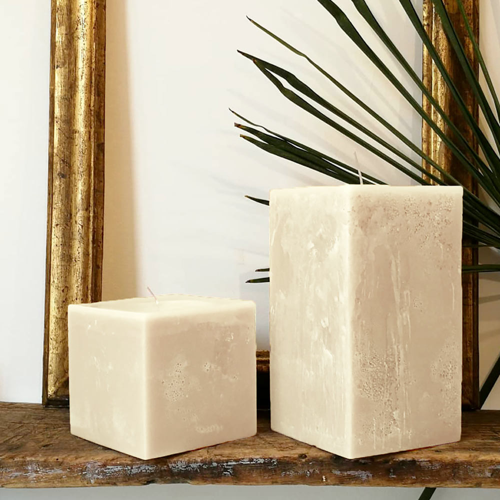 Përbërja e 3 qirinjve katrorë të madhësive të ndryshme dhe të disponueshme në ngjyra të ndryshme të bëra nga dylli Made in Italy.