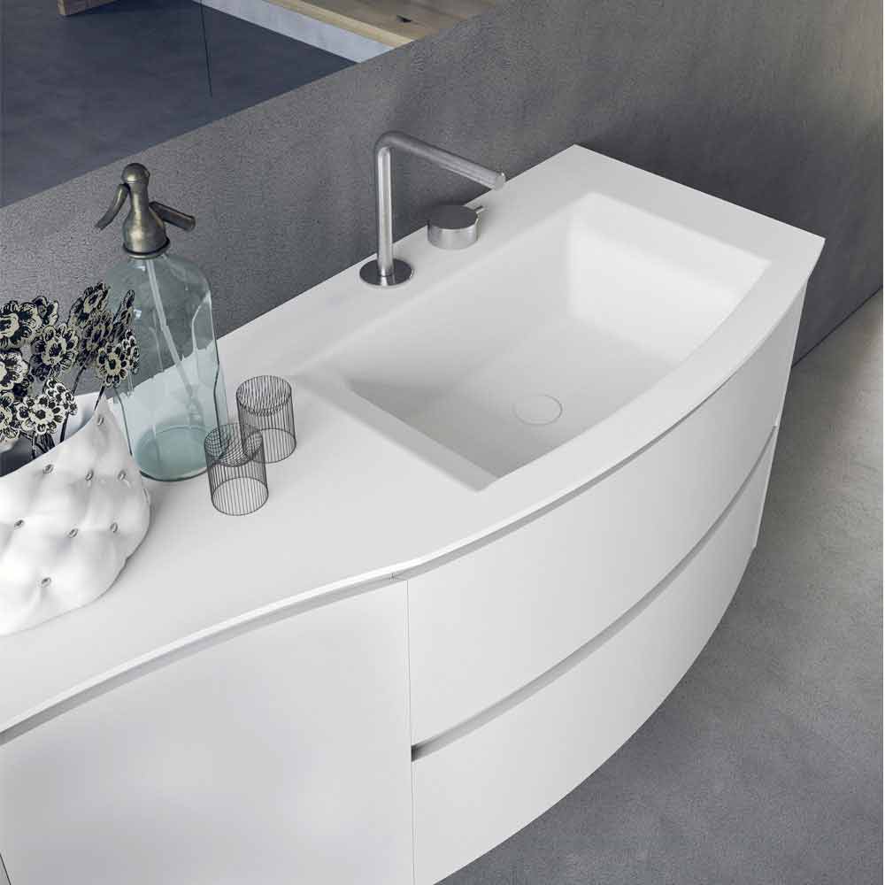 Përbërja minimale e banjës, dizajn i varur dhe i lakuar me lavaman të integruar, prodhuar në Itali.
