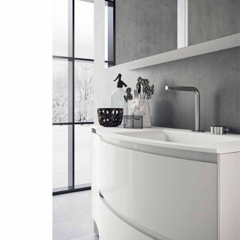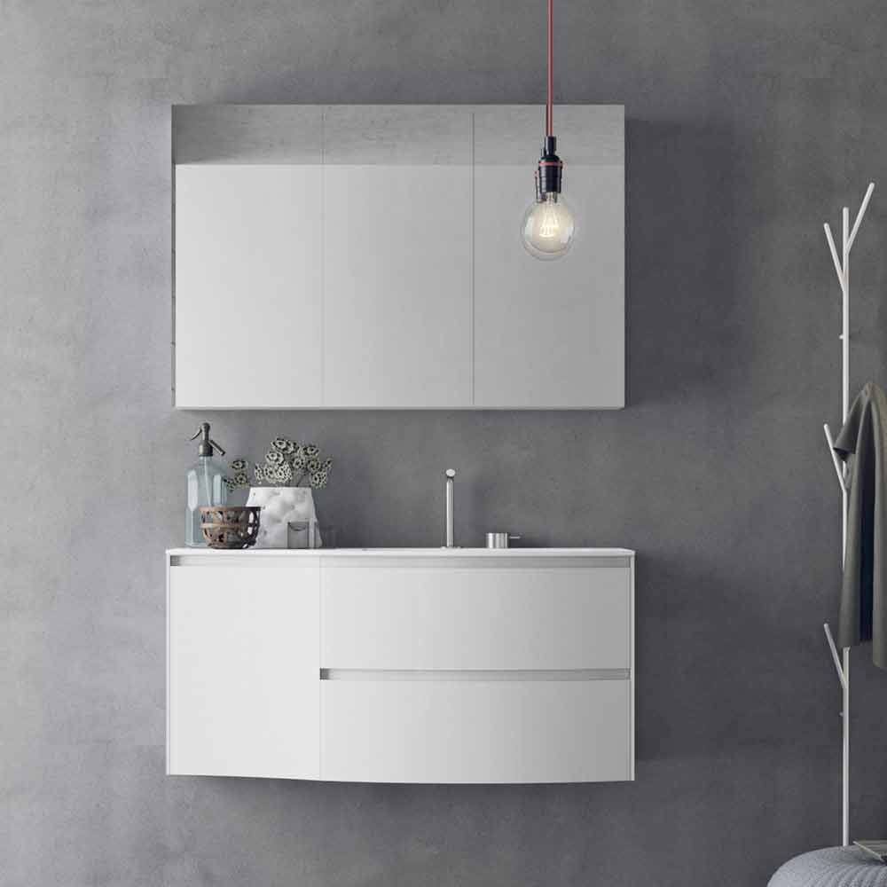 Mobilje banjo me lëmuar fronte të bardhë lacquered lakuar, lavaman integruar në Novcryl bardhë me shkëlqim, kabineti pasqyrë me 3 dyer në të bardhë me shkëlqim.
