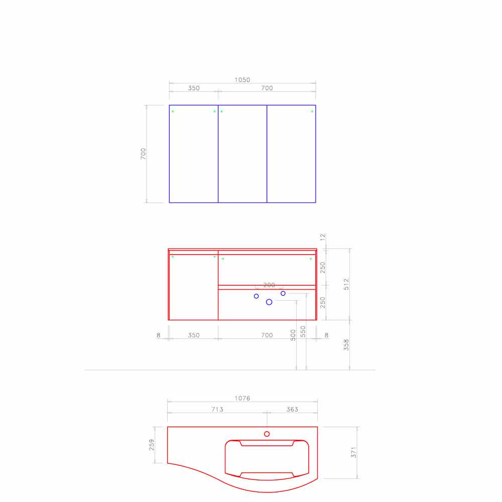 Përbërja përfshin: 1 L.70 x P.43 x H.50 cm 2 L.35 x P37 / 26 x H.50 cm 3 L.107x P.42 x H.50 cm Lavaman i integruar 3A 4 L.105 x P.16 x H.70 cm