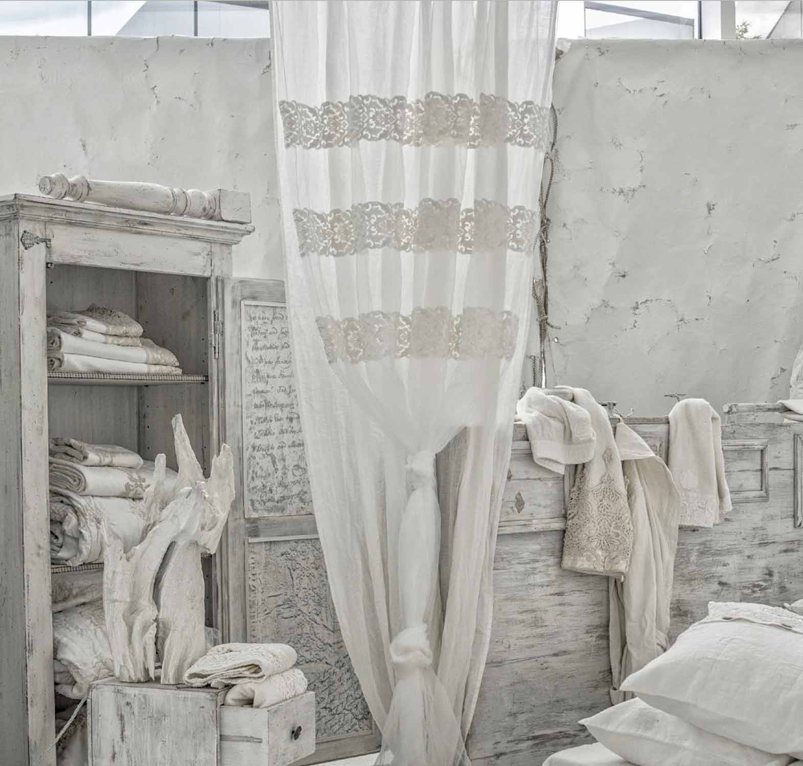 Perde në liri dhe organza dhe qëndisje, dizajni i zejtarisë luksoze i bërë në Itali.