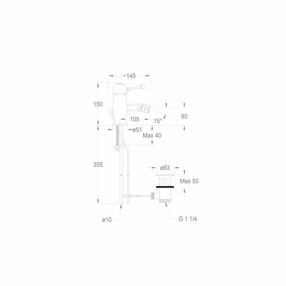 Përzierës bidet me countertop me dizajn klasik në bronz të përfunduar kromi 150 mm i lartë dhe 105 mm distancë në qendër, me kullues dhe shufër tërheqëse. Prodhuar tërësisht në Itali me materiale me cilësi të lartë në përputhje me standardet evropiane. Ky mikser mund të instalohet në pjesën e sipërme, i pajisur me një aerator rregullues dhe fishek disk qeramik; rekomandohet për sistemin e tij të Kursimit të Energjisë për kursimin e ujit prej 6L / min dhe për shtojcat e tij të ngurtë.
