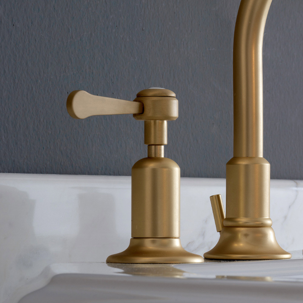 Ky rubinet i hollë grykë e lartë me 3 vrima dheme kullues è tërësisht të punuar me dorë nga mjeshtrit me përvojë në industri prej bronzi të rëndë , të derdhur në kallëpe që respektojnë sistemet artizanale të së shkuarës dhe të mbrojtur me një shtresë të trashë bronzi mat.