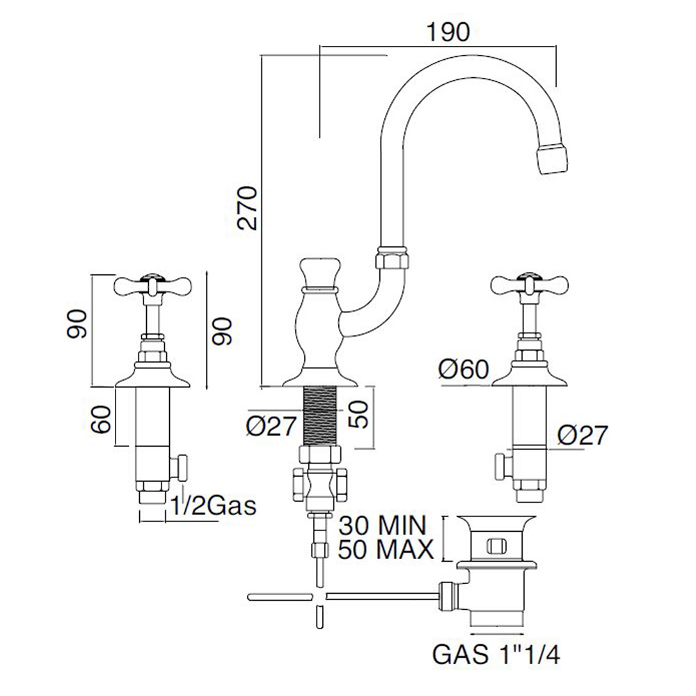 rubinet i rafinuar i legenit për lavaman me 3 vrima me grykë të lartë dhe kullues è tërësisht