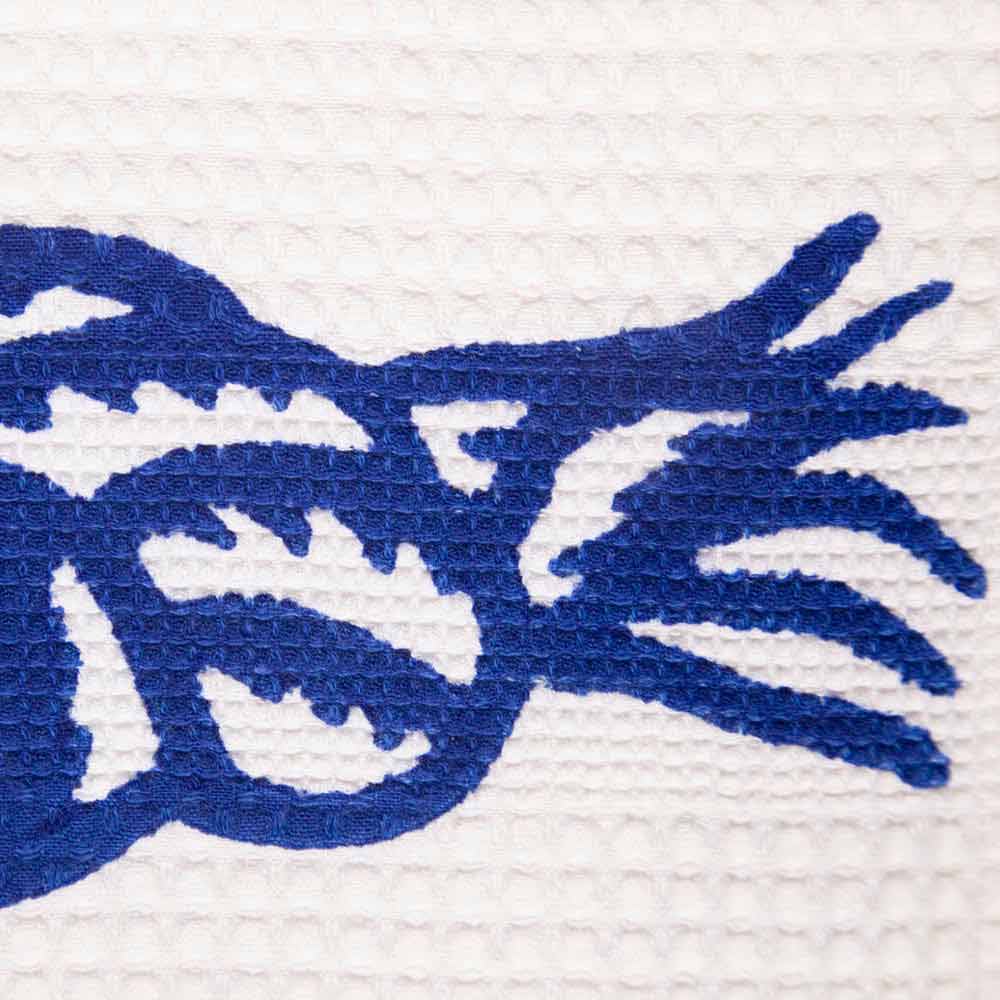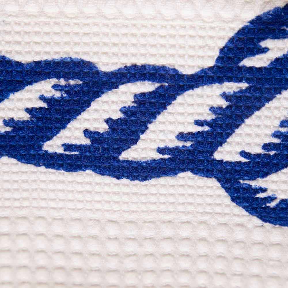 Peshqir banjosh i punuar shumë, blu e shtypur me dorë mbi pambuk të bardhë me një vizatim litar të lashtë detar me nyjë, një copë ekskluzive me cilësi Made in Italy.