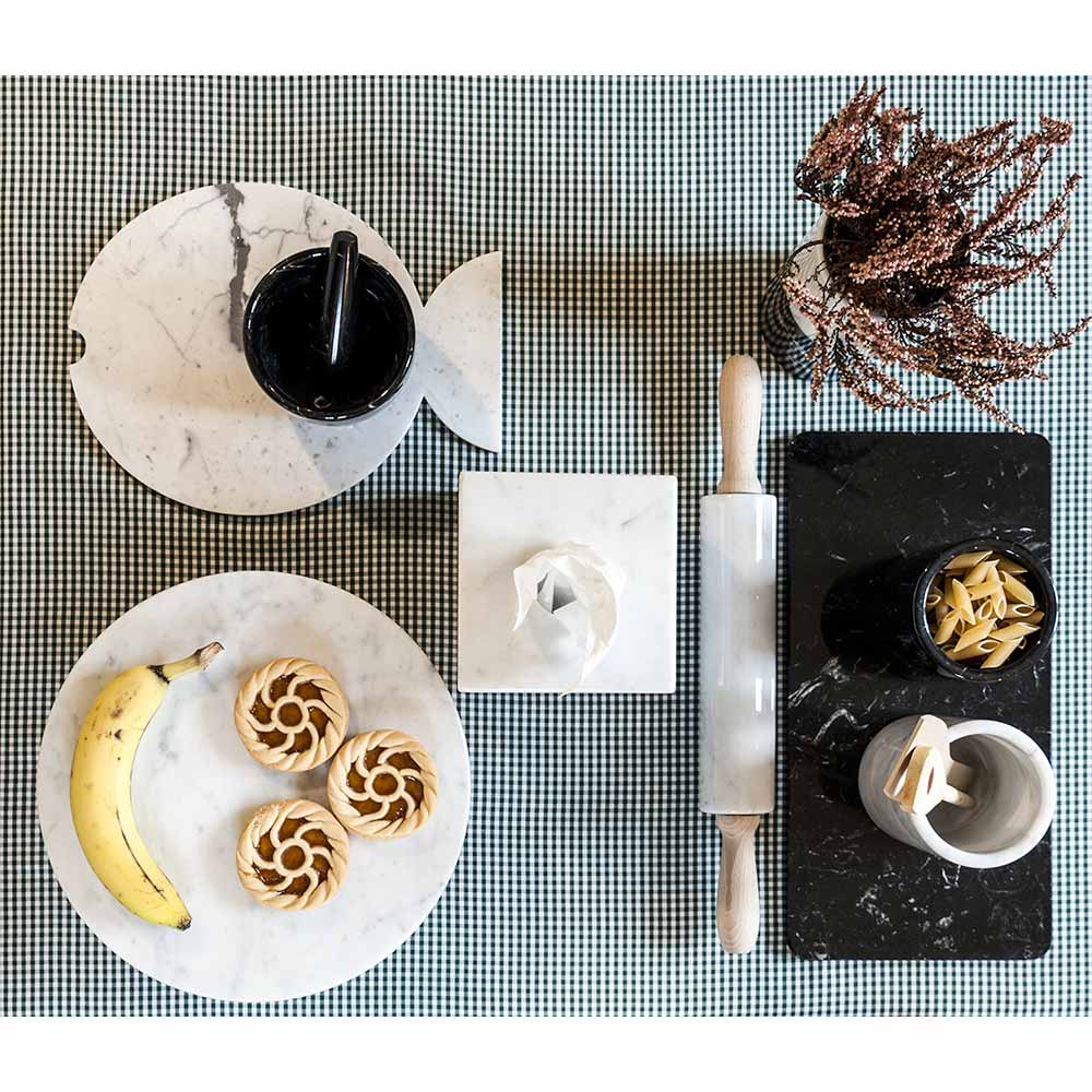 Pilota moderne e bërë në 3 variante mermeri: mermeri i bardhë Carrara, mermer gri Bardiglio dhe mermer Paonazzo. Mermeri i përdorur është i çmuar dhe mecilësi tëlartë . Isshtë një copë unike pasi çdo bllok mermeri i përdorur ndryshon nga të tjerët për venat dhe nuancat. Mermeri i bardhë Carrara i përdorur për krijimin e këtyre produkteve vjen nga gurorja Poggio Silvestre, një burim mermeri me cilësi të parë të klasifikuar që nga shekulli i kaluar. Nga ana tjetër, Mamo Bardiglio ka një bazë gri kompakte dhe vija të bardha. Mermeri Paonazzo , një larmi mermeri i hollë tipik i traditës italiane, karakterizohet nga një sfond i bardhë me gjalpë me venat nga bluja intensive në portokalli.