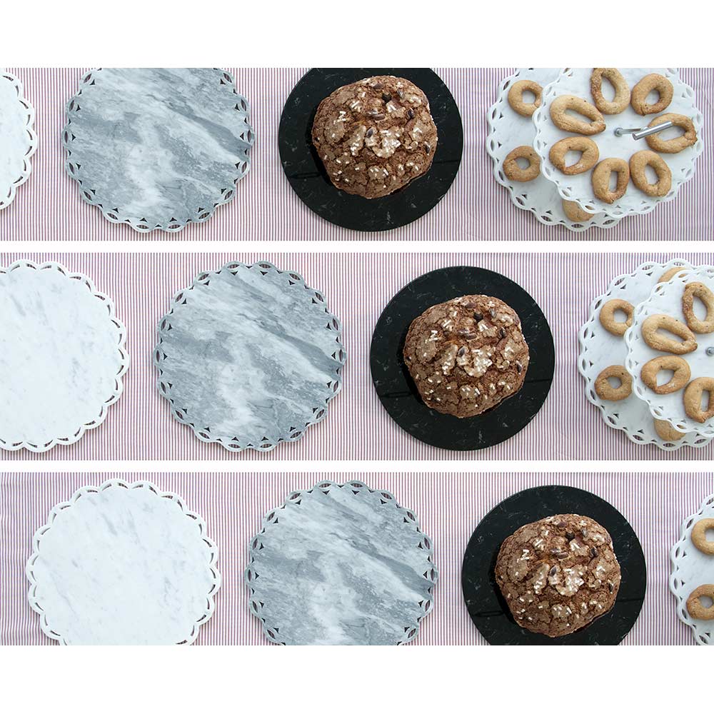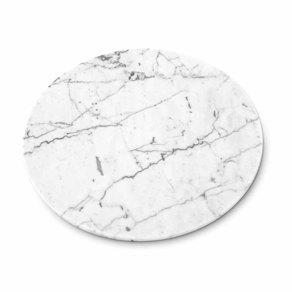 Pllakë elegante moderne e djathit e rrumbullakët e bërë nga 2 variante mermeri: mermer i bardhë Carrara dhe mermer i zi Marquinia. Bërë nga mermer i çmuar me cilësi të lartë , është një copë unike pasi çdo bllok mermeri i përdorur ndryshon nga të tjerët në venat dhe nuancat.
