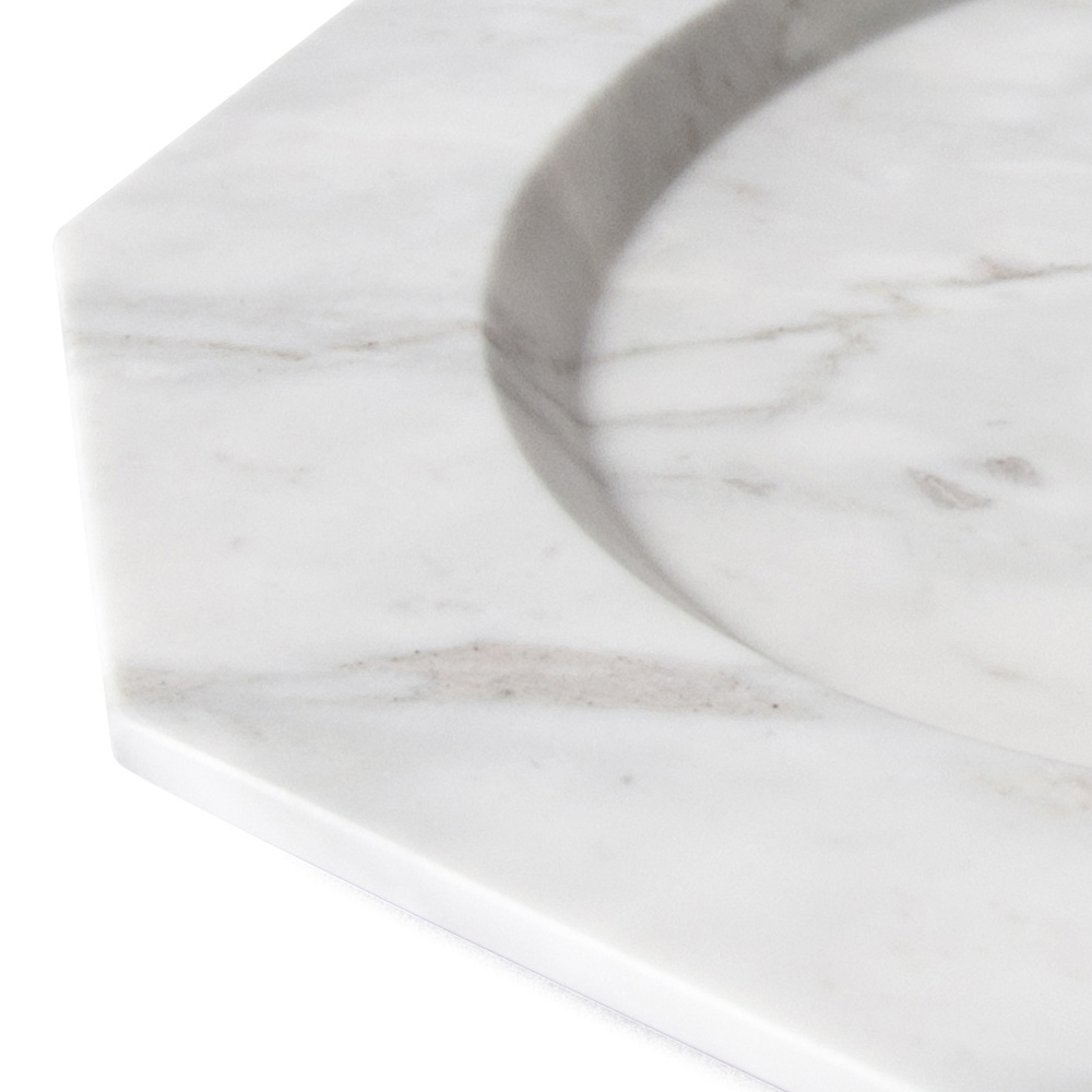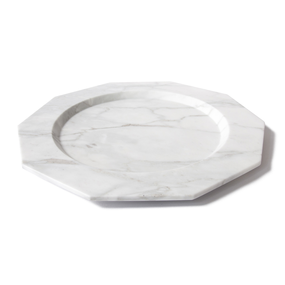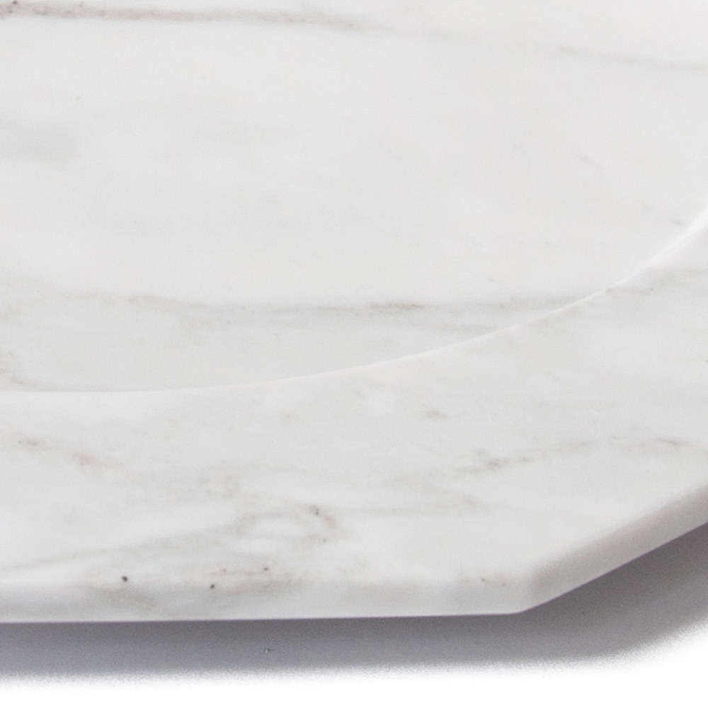 Kjo pjatë e sheshtë për servirje karakterizohet nga forma e saj dhjetëkëndëshe dhe eleganca që lëshon dhe që e jep si në tavolinë ashtu edhe si objekt dekorimi. Një dizajn i sofistikuar dhe i rafinuar i aftë për t'u bërë protagonist në mjedisin e destinacionit falë thelbësores së tij të theksuar nga mermeri Arabescato Carrara i përfunduar me saten me të cilin është bërë.
