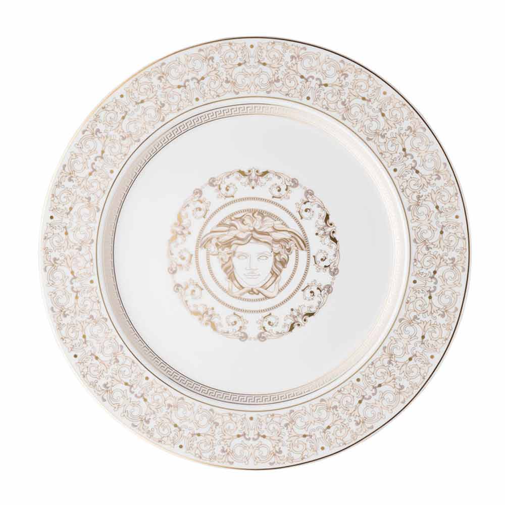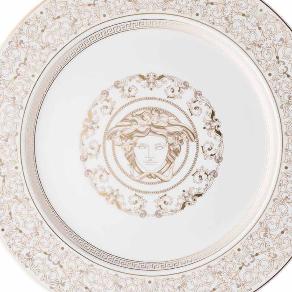 Pjatë me kartë vendore prej porcelani Rosenthal Versace Medusa Gala Pllaka përrallore e kartonit 30 cm nga Versace është pjesë e koleksionit të rafinuar dhe luksoz të tavolinave Medusa Gala. Frymëzuar nga bujaria dhe atmosfera unike e darkave gala, Medusa Gala riinterpreton motivet tradicionale të Versace në dizajn dhe dekorim: përshkrimi ikonik i Medusa-s alternohet me ornamente të rafinuara barok në një filigran ari të çmuar. Një efekt kontrasti emocionues midis bardhësisë së porcelanit dhe arit të pastër i jep jetë një ambienti të përsosur, modern dhe në të njëjtën kohë unik. E pasuruar me motive dhe dekorime tërësisht në ar, Medusa Gala vjen në një version edhe më luksoz "Gold", perfekt për të integruar dhe zbukuruar më tej tryezën.