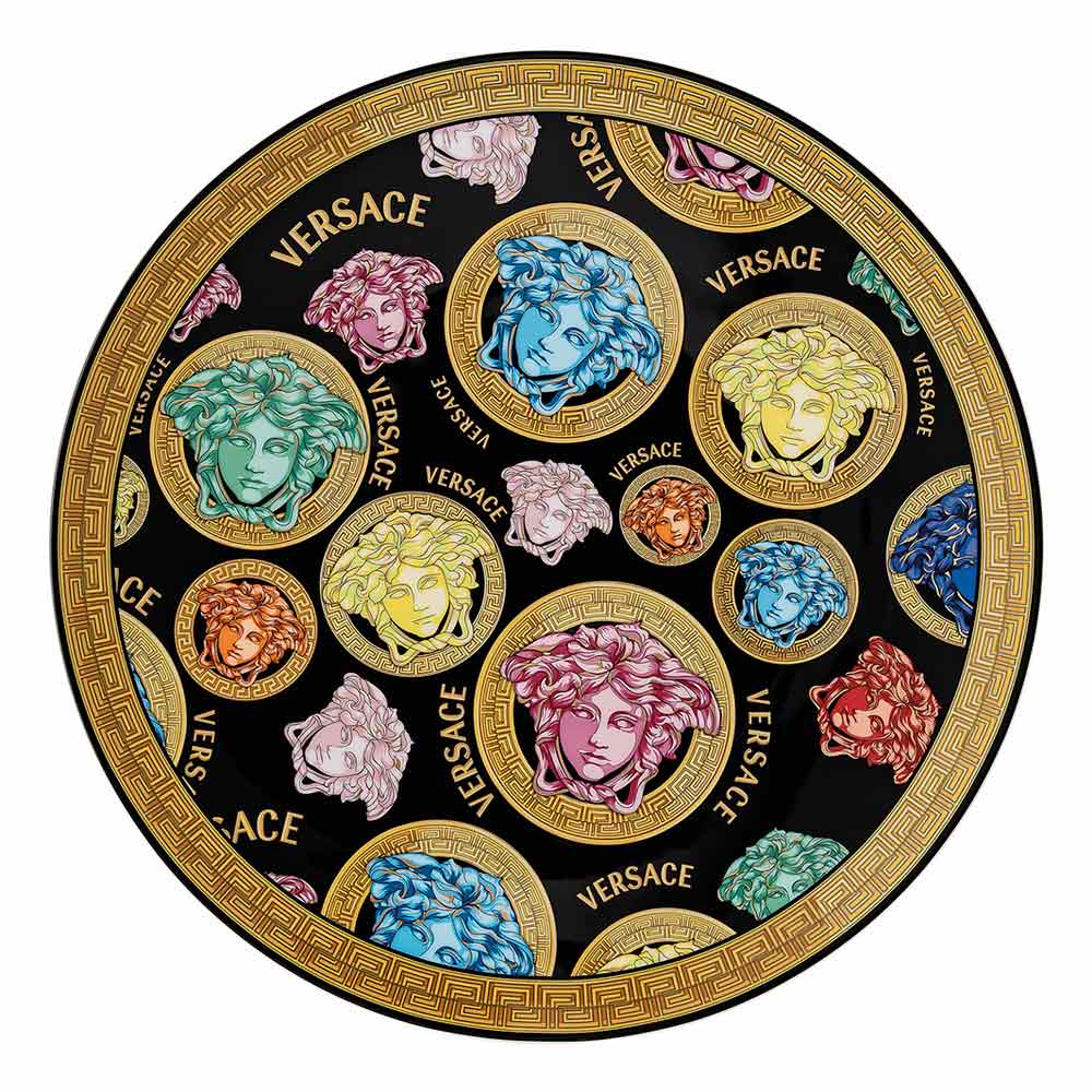 Placemat me shumë ngjyra Medusa Amplified nga Versace , i punuar nga porcelani i imët , është një shpërthim stili dhe kreativiteti. Dizajni i guximshëm kombinon simbolin ikonik Medusa në një grup të gjallë ngjyrash, të cilat dallohen në sfondin e zi të thellë , duke krijuar një kontrast dinamik dhe tërheqës. E gjithë është përshtatur nga një motiv i rafinuar i artë grek , një emblemë e luksit të përjetshëm të Versace.