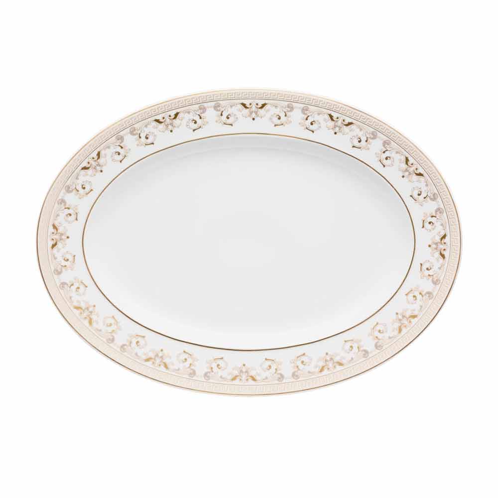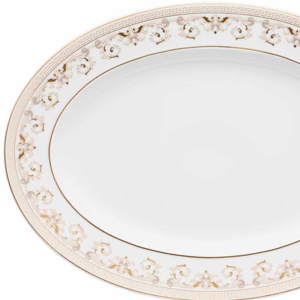 Rosenthal Versace Medusa Gala Pjatë Ovale 34cm Dizajn Porcelan Pjata ovale 34x24,5 cm nga Versace është pjesë e koleksionit të rafinuar dhe luksoz të tavolinave Medusa Gala. Frymëzuar nga bujaria dhe atmosfera unike e darkave gala, Medusa Gala riinterpreton motivet tradicionale të Versace në dizajn dhe dekorim: përshkrimi ikonik i Medusa-s alternohet me ornamente të rafinuara barok në një filigran ari të çmuar. Një efekt kontrasti emocionues midis bardhësisë së porcelanit dhe arit të pastër i jep jetë një ambienti të përsosur, modern dhe në të njëjtën kohë unik. E pasuruar me motive dhe dekorime tërësisht në ar, Medusa Gala vjen në një version edhe më luksoz "Gold", perfekt për të integruar dhe zbukuruar më tej tryezën.