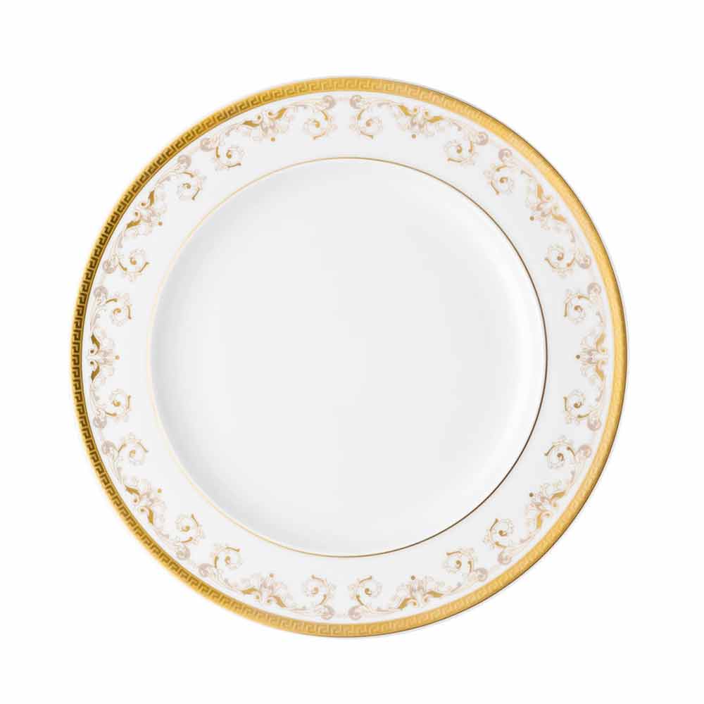 Rosenthal Versace Medusa Gala Gold Pjatë e sheshtë 27cm dizajn porcelani Pjata e sheshtë 27 cm nga Versace është pjesë e koleksionit të rafinuar dhe luksoz të tavolinave Medusa Gala Gold. Frymëzuar nga bujaria dhe atmosfera unike e darkave gala, Medusa Gala riinterpreton motivet tradicionale të Versace në dizajn dhe dekorim: përshkrimi ikonik i Medusa-s alternohet me ornamente të rafinuara barok në një filigran ari të çmuar. Një efekt kontrasti emocionues midis bardhësisë së porcelanit dhe arit të pastër i jep jetë një ambienti të përsosur, modern dhe në të njëjtën kohë unik. E pasuruar me motive dhe dekorime tërësisht në ar, Medusa Gala vjen në një version edhe më luksoz "Gold", perfekt për të integruar dhe zbukuruar më tej tryezën.