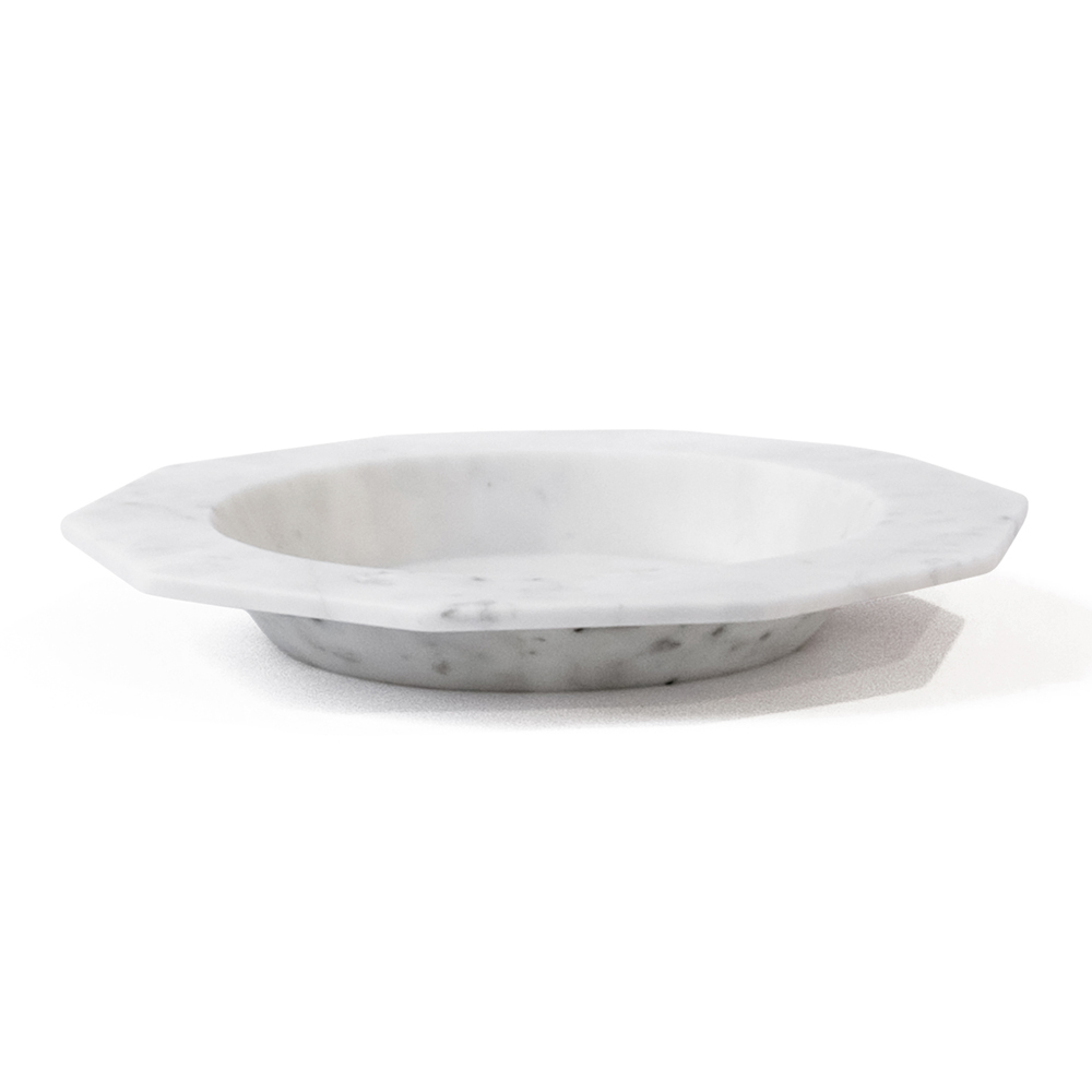 Kjo pjatë mermeri është një bashkim magjepsës i funksionalitetit dhe artit . Mermeri i bardhë elegant me damarët gri të çelur është punuar në formë organike, me onde, që të kujton petalet e një luleje të sapoçelur, duke ftuar kështu natyrën në tryezë.