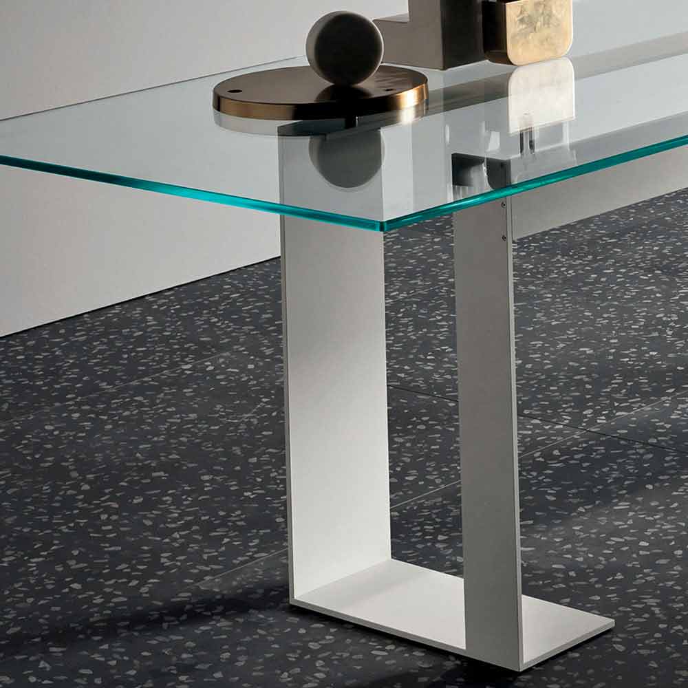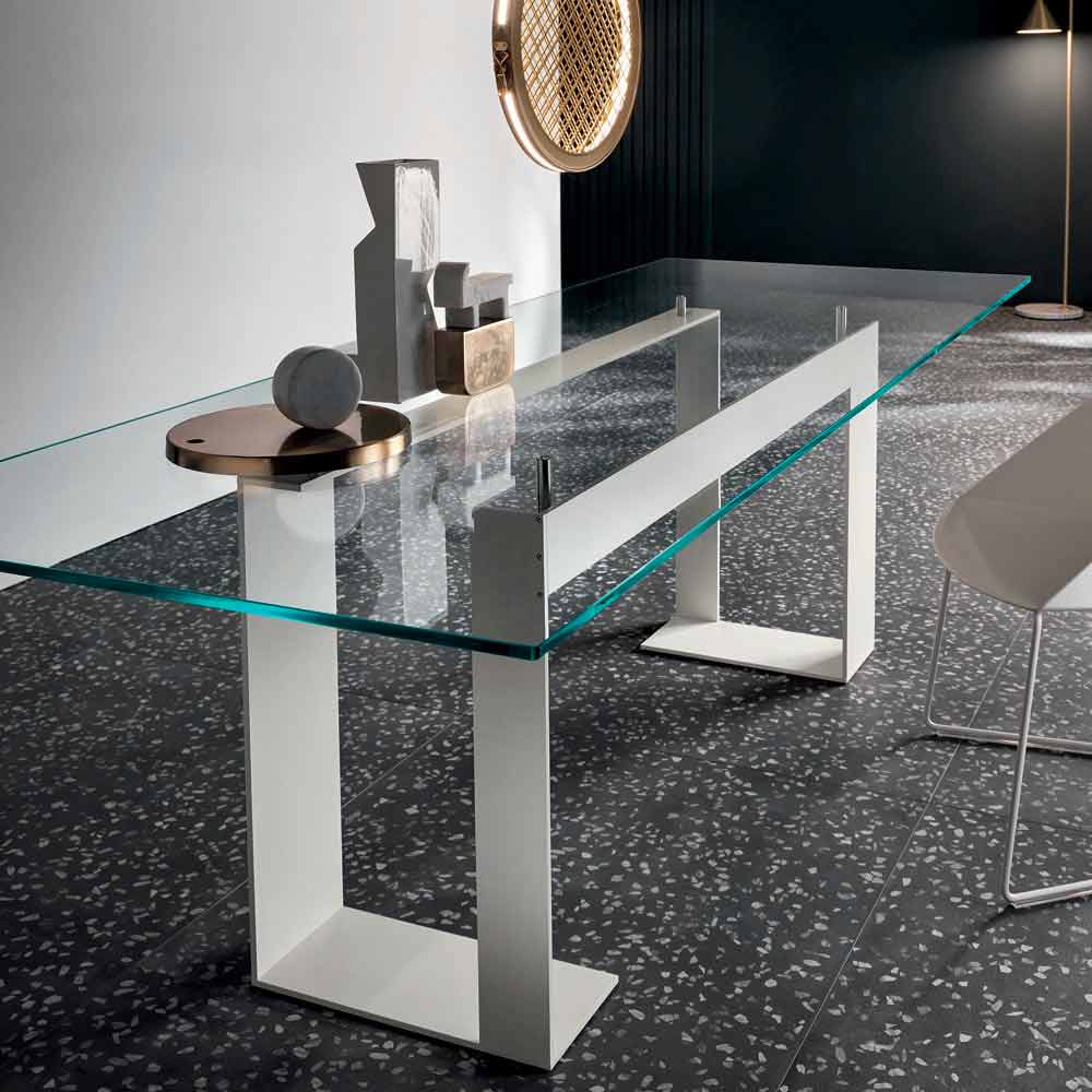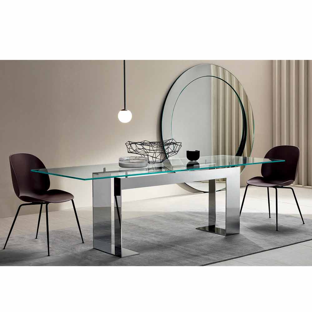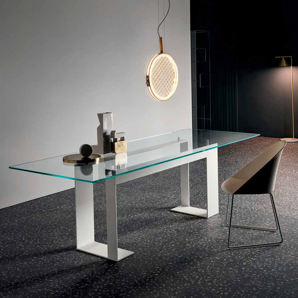 Kjo tryezë ngrënie ka një majë xhami të pastër tepër të pastër që mbështetet në 4 mbështetëse që e heqin atë nga struktura metalike e disponueshme në 3 përfundime dhe 4 madhësi të ndryshme.