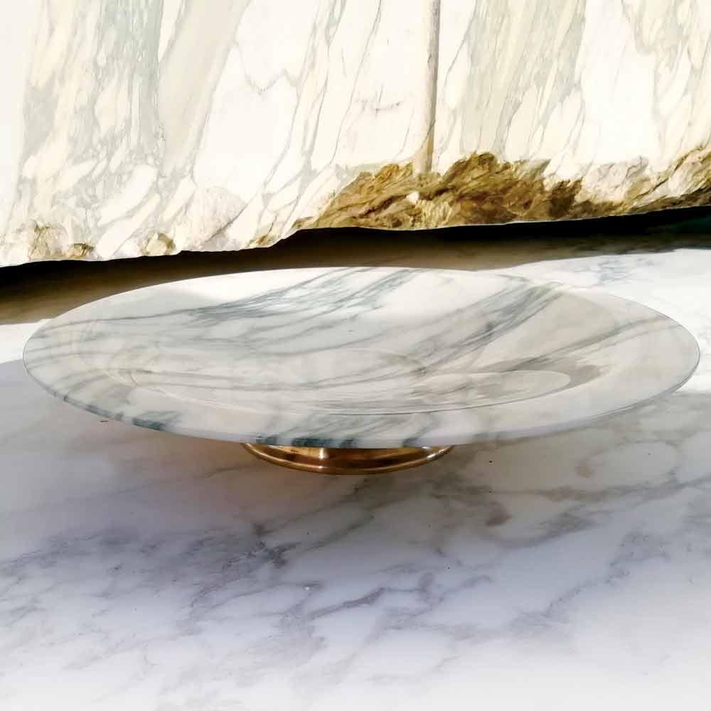 Pjesa qendrore e karakterizuar nga një dizajn i sofistikuar dhe forma e tij me linja tësinqerta dhe harmonike që i japin produktit një pamje të lehtë dhe moderne. Prodhuar në Itali me dorë , ky produkt është i përbërë nga një bazë metali e përfunduar në ar dhe një pllakë e rrumbullakët në mermer Brezza della Versilia , një mermer kompakt me një bazë të ngrohtë të bardhë dhe venat e akuamarinës që kujtojnë flladin e detit, duke krijuar një efekt origjinal dhe të rafinuar . . Përfundimi është me shkëlqim dhe merret falë një procesi artizanal që i jep produktit cilësi dhe përsosje të mëtejshme. Kombinimi i materialeve, përfundimeve dhe teknikave të përdorura së bashku me punën e mrekullueshme të mjeshtrit mjeshtër lejojnë të merrni një produkt përfundimtar me cilësi të lartë me vëmendje në detaje dhe perfekt për zbukurimin e mjediseve me një shije bashkëkohore dhe të sofistikuar.
