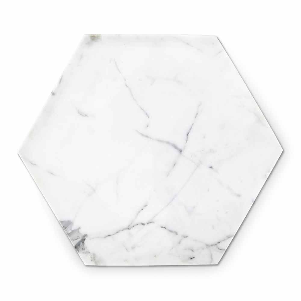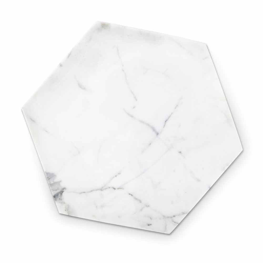 Pllakë gjashtëkëndore moderne në mermer të bardhë Carrara me shtresën bazë të tapës. Falë dizajnit të tij mund të përdoret gjithashtu si një tabaka ose dërrasë prerëse. Bërë nga mermer i çmuar me cilësi të lartë, është një copë unike pasi çdo bllok mermeri i përdorur ndryshon nga të tjerët në venat dhe nuancat. Mermeri i bardhë Carrara i përdorur për krijimin e këtyre produkteve vjen nga gurorja Poggio Silvestre, një burim mermeri me cilësi të parë të klasifikuar që nga shekulli i kaluar. Çdo produkt është gjithashtu i punuar me dorë nga profesionistë të specializuar për breza në përpunimin e mermerit.