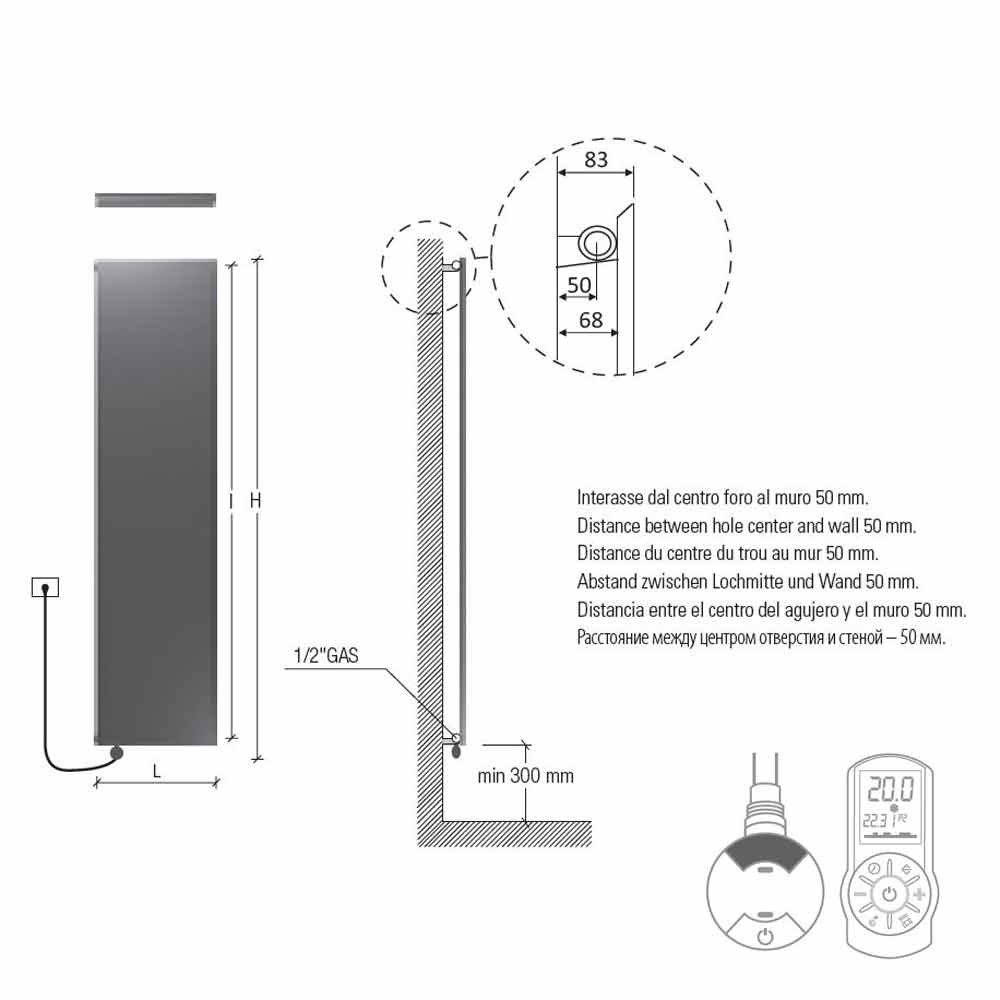 Termostati 110 mm duhet të shtohet në lartësi. Kuti termostatike e bardhë si standard për radiatorët e bardhë; krom për radiatorët me ngjyra dhe përfundimet e çelikut. Furnizim me energji elektrike me një fazë 230 volt.