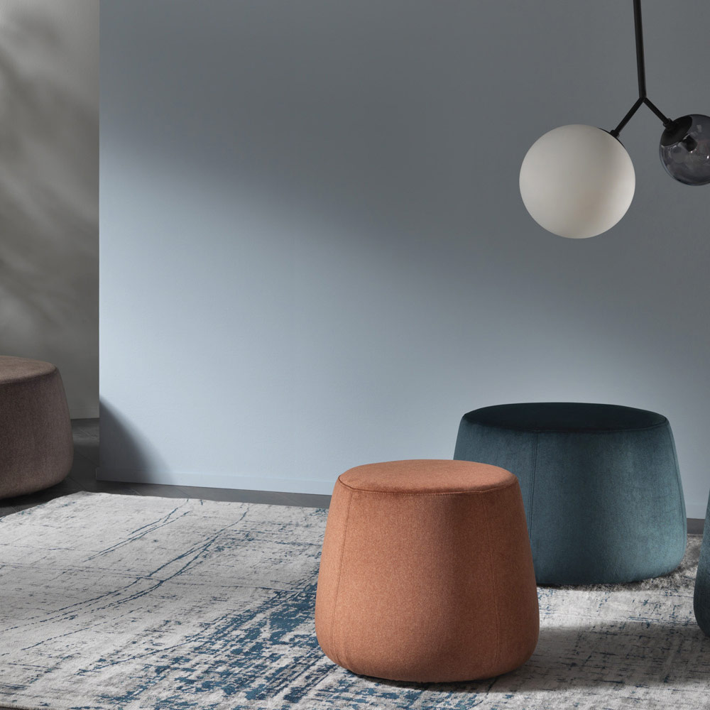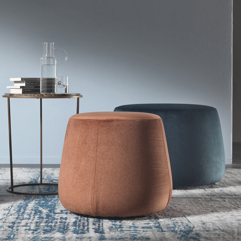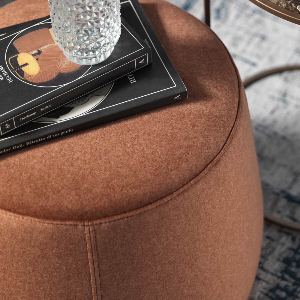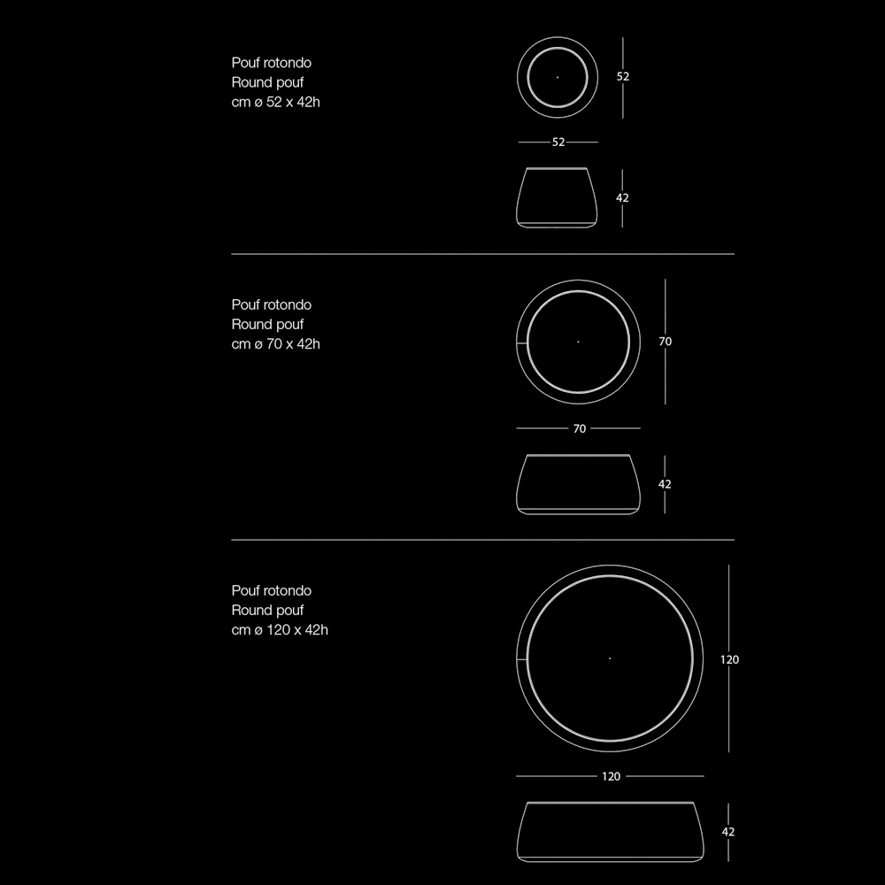 Pufi i modelit modern dhe të rrumbullakët , i disponueshëm në tre gjerësi të ndryshme, është plotësisht i mbuluar me kadife të butë të lëvizshëm, i disponueshëm në 6 përfundime.
