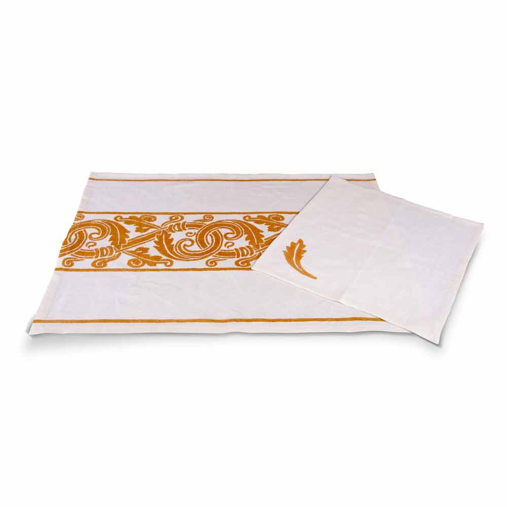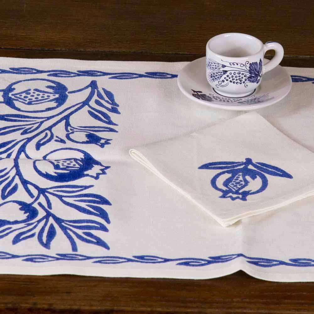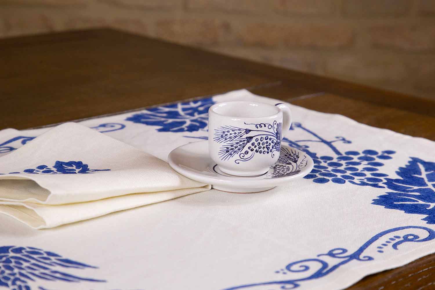 Shërbimi i mëngjesit artizanal (placemat dhe pecetë) i bërë prej liri të pastër me shtypje artistike në pëlhura antike të dekoruara me dorë, të disponueshme në tre variante, një copë unike e cilësisë e bërë në Itali.