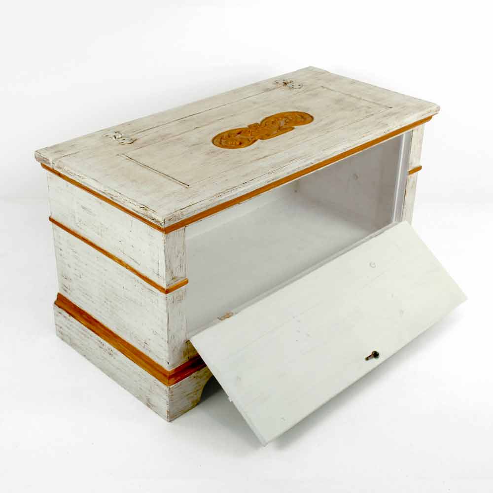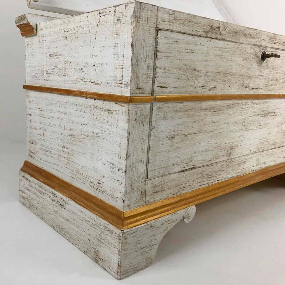 Punuarme kraharor në Itali me strukturë në dru bredhi të ngurtë, me përfundim të bardhë të moshuar, i pajisur me hapje të dyfishtë (sipër dhe përpara) dhe detaje të pikturuara me dorë në ngjyrë ari antike Produkti përfundon me një përfundim transparent që e bën atë të papërshkueshëm nga uji dhe rregullon ngjyrat për t'i bërë ato të pandryshueshme me kalimin e kohës.