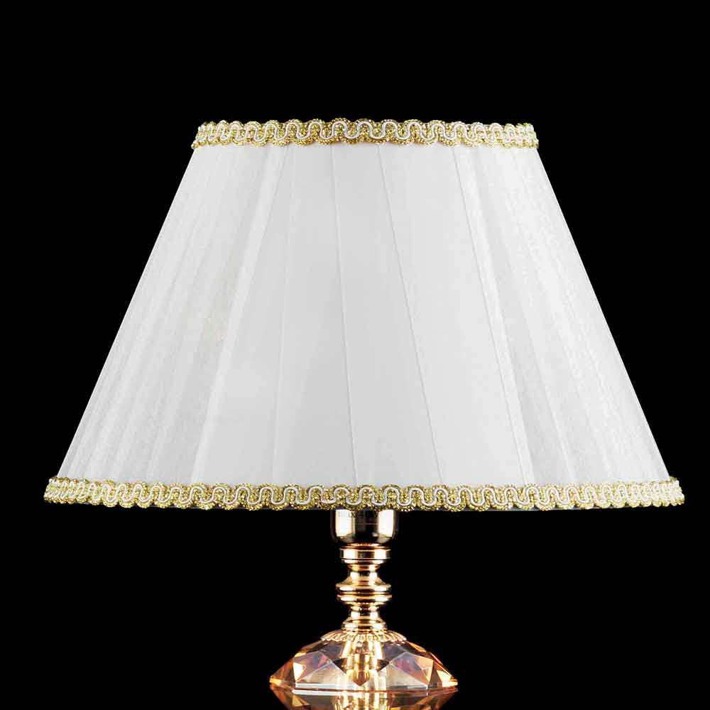 Llambë me dizajn klasik me xham qelibar dhe kristal, me fije ari. Abazhur organza dhe pongè.