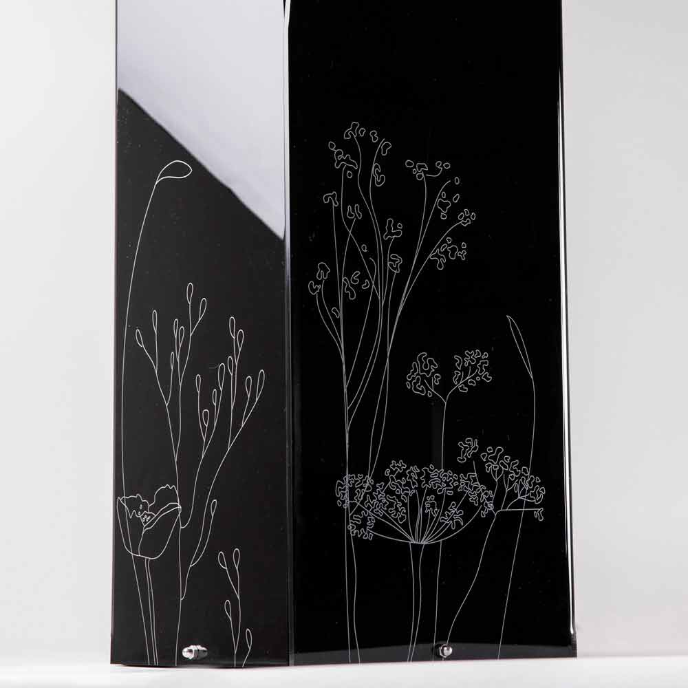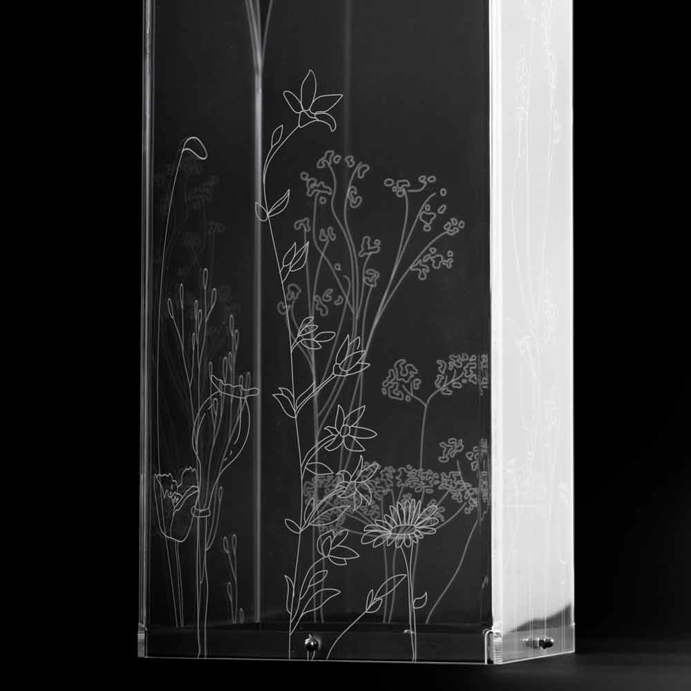 Mbështetja e çadrës në pleksiglas është bërë në dy përfundime dhe karakterizohet nga dekorimet me lule të shënuara me lazer me një stil të stilizuar me një bazë çeliku inox.