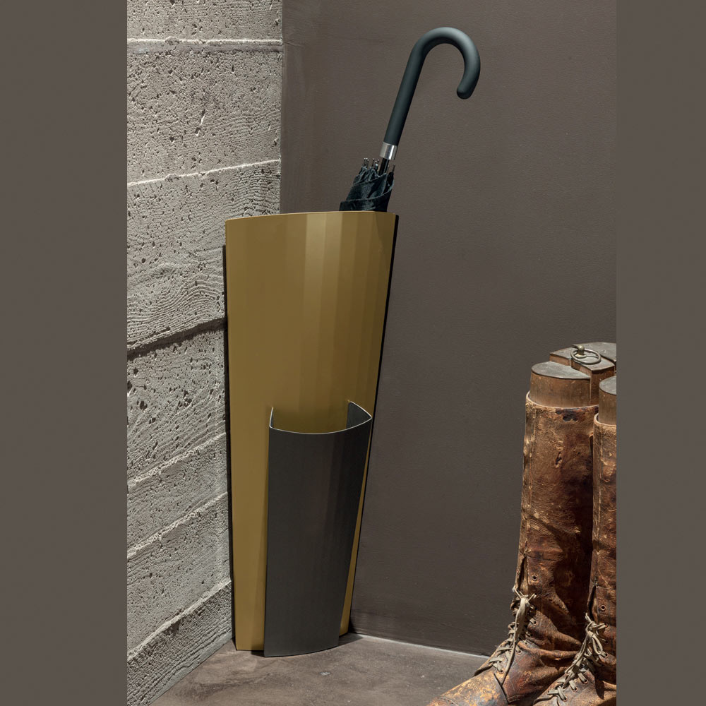 Qëndrim ombrellë në llamarina të lyera me ar dhe bronz të stampuar , tërësisht Prodhuar në Itali. Stenda ombrellë me një dizajn origjinal dhe funksional. Ajo ka një strukturë fletë metalike të lyer me ngjyrë të zezë dhe ari, të zbukuruar me punim me fasadë që të kujton një plis elegant. Kjo ombrellë jo vetëm që kryen funksionin e saj parësor në mënyrë efektive, por gjithashtu shton një prekje elegance dhe stili në hyrjen e shtëpisë ose zyrës tuaj falë dizajnit të saj të veçantë dhe materialeve me cilësi të lartë të përdorura në ndërtimin e saj.