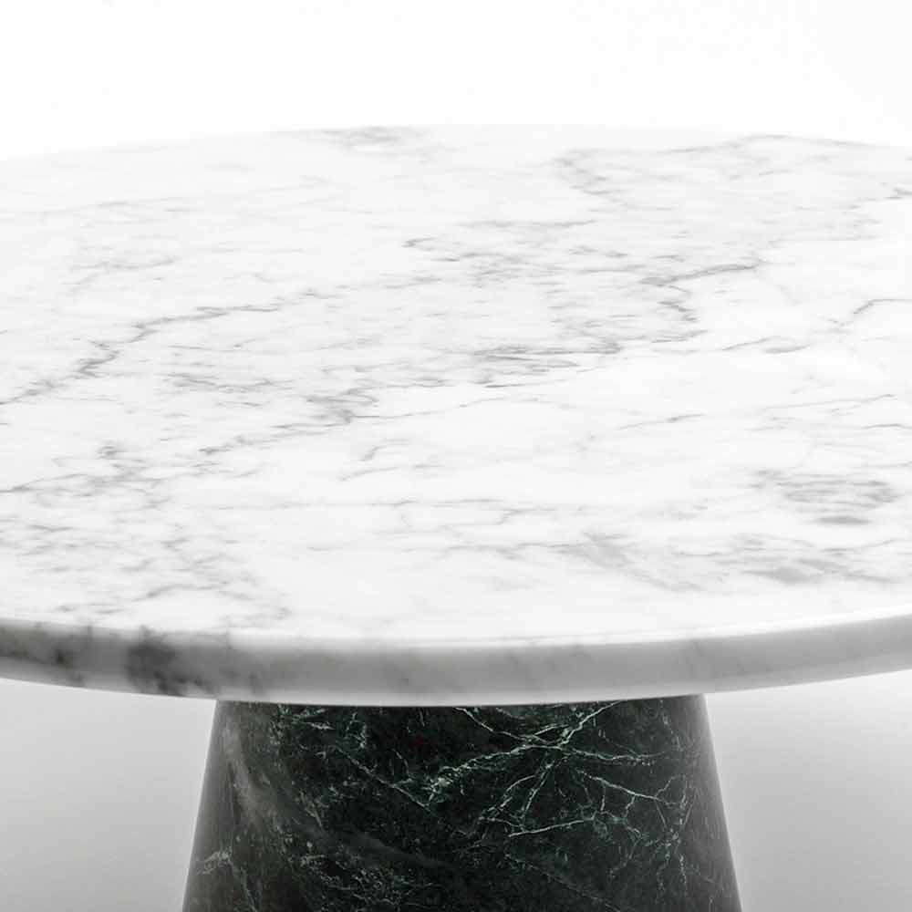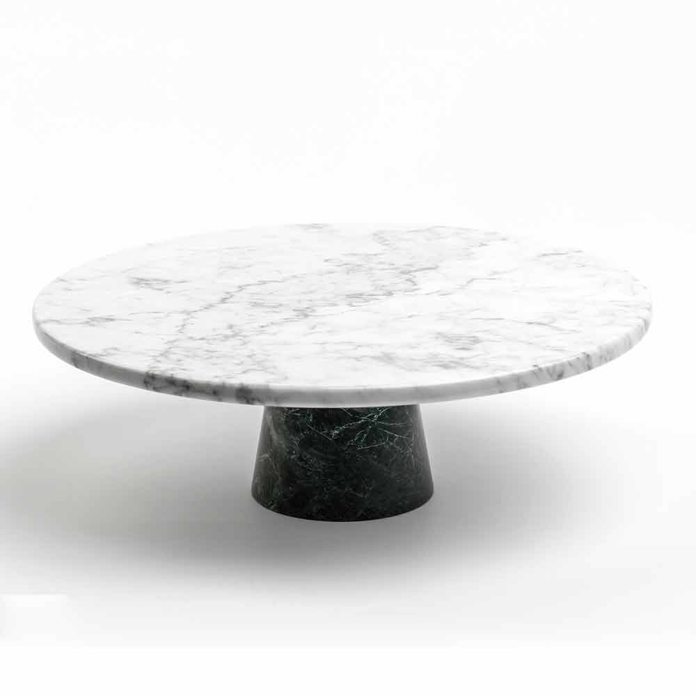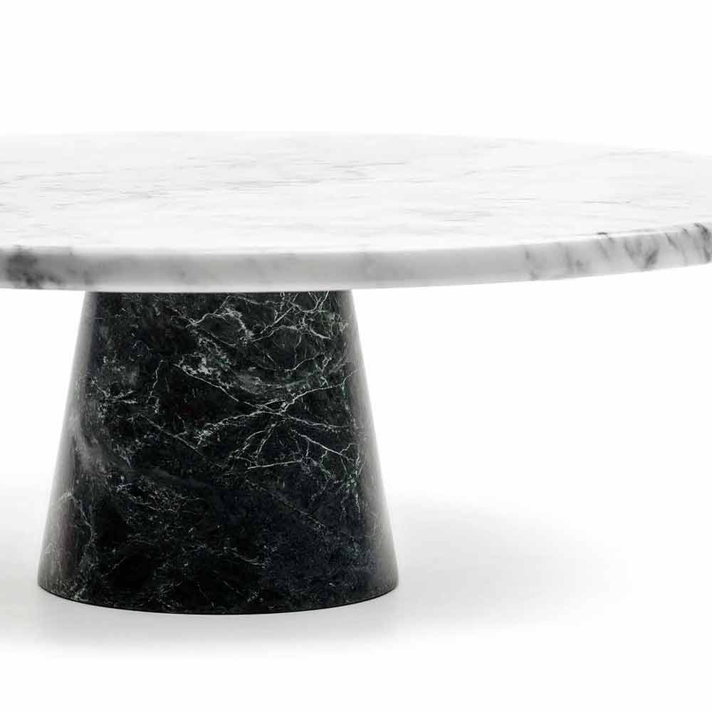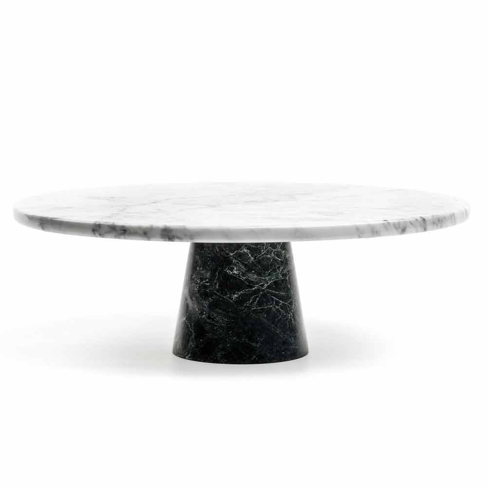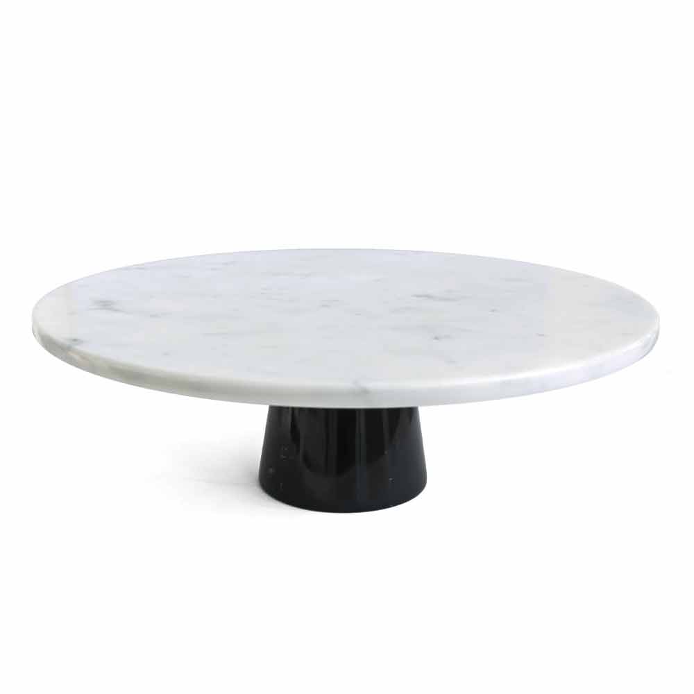 Stendë elegante për tortë moderne me majë të bardhë mermeri Carrara dhe bazë të zezë mermeri Marquinia . Bërë prej mermeri të hollë me cilësi të lartë. Isshtë një copë unike pasi çdo bllok mermeri i përdorur ndryshon nga të tjerët për venat dhe nuancat.