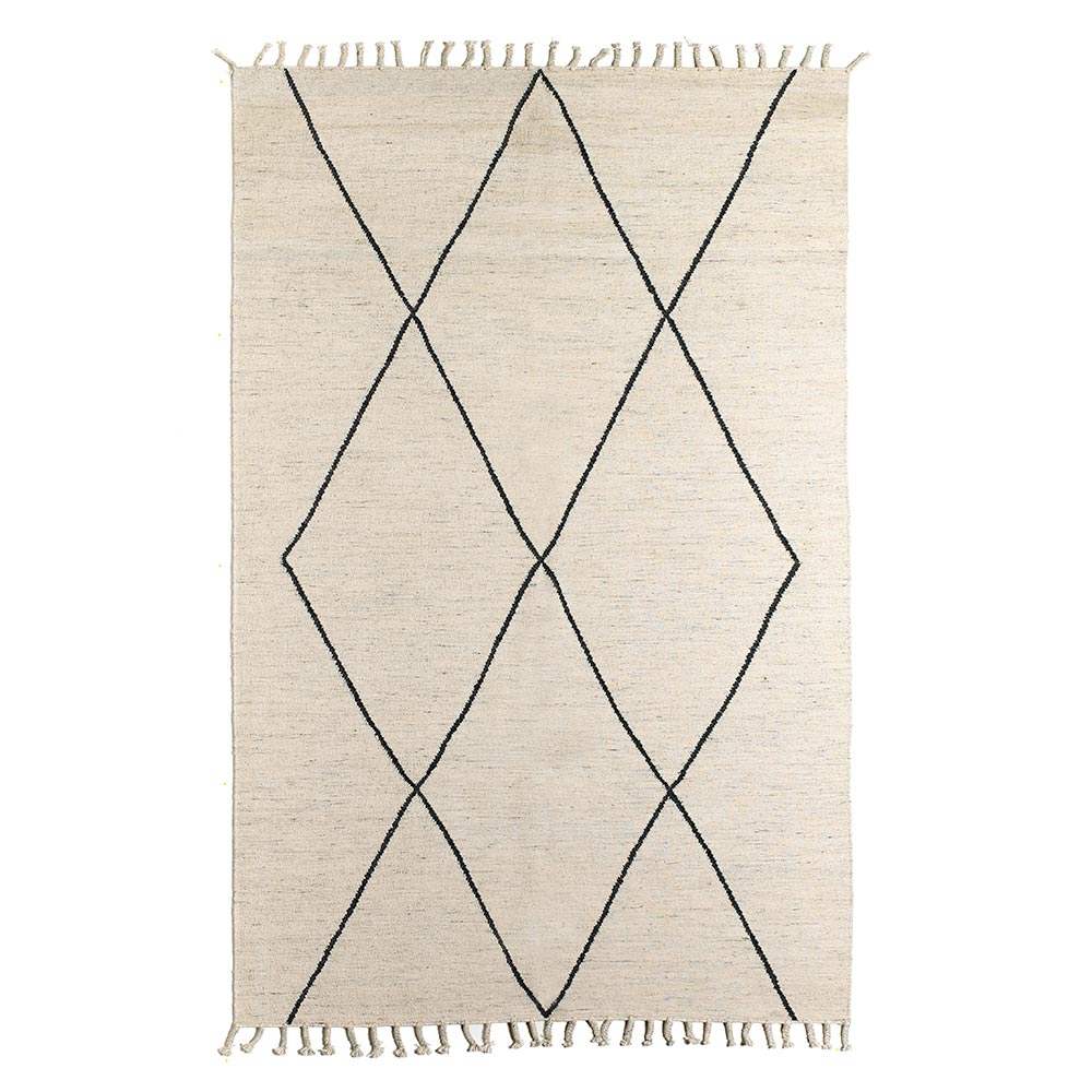 Kjo qilim është bërë prej leshidhe pambuku dhe quhet " kilim " ose një qilim pa flokë që nuk është i lidhur me nyje por i endur me dorë nga endësit ekspertë. Krahasuar me një qilim klasik është më i lehtë dhe me më pak trup dhe është perfekt si një send dekorativ për të pasuruar dekorin e çdo dhome. Ajo që karakterizon produktin në veçanti është modeli gjeometrik në nuancat e së zezës që i jep modernitetit së bashku me skajet që mbulojnë dy anët më të shkurtra të tapetit. Materialet dhe teknikat e përdorura bëjnë të mundur marrjen e një produkti përfundimtar me cilësi të lartë të aftë për të tërhequr vëmendjen ndaj vetes, duke e bërë çdo mjedis unik.