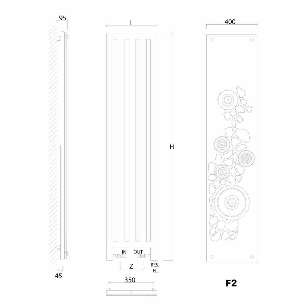 | Masat | L.400 mm, H.1800 mm, P.85 mm, distanca e qendrës 172 mm, Prodhimi termik 720 Watt, Kapaciteti 10.2 Lt, Pesha 29.5 Kg |