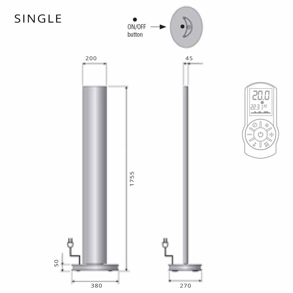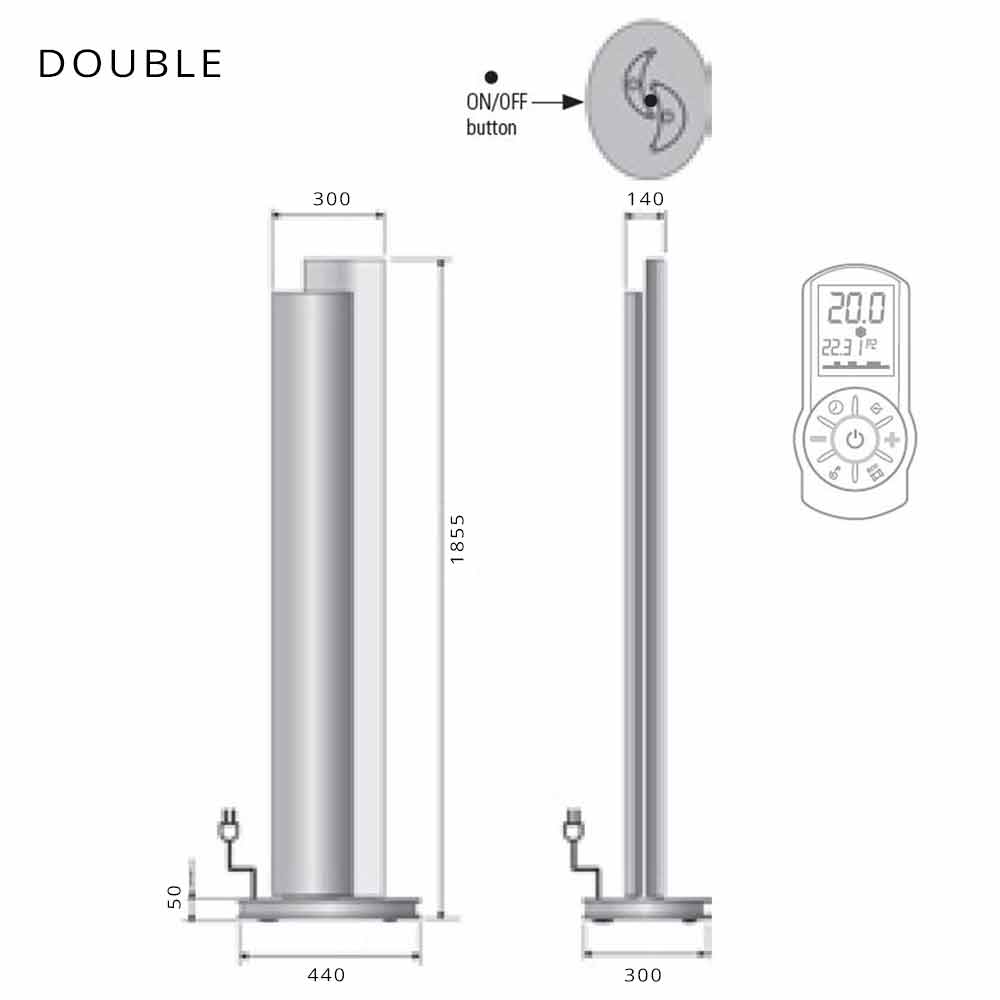 Ky ngrohës ka 250 vat energji për versionin e vetëm dhe 500 vat për versionin e dyfishtë, të furnizuar me telekomandë standarde për rregullimin e dritave LED dhe termostatit me programimin ditor / javor. Kabëll 1.5 metër me prizë schuko. Furnizimi me energji njëfazore 230 volt.