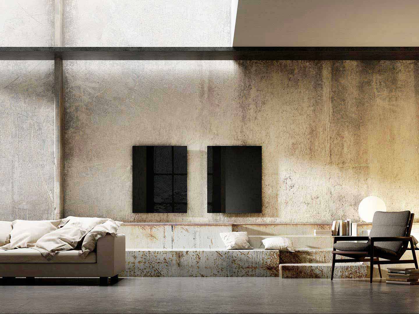qelqi rrezatues me energji elektrike me rrezatim infra të kuqe. Është zgjidhja ideale për ata që duan një sistem ngrohjeje elegante dhe ekonomike. Ai përbëhet nga dy fletë xhami të laminuara së bashku, njëra prej të cilave ka një sipërfaqe që mund të stimulohet elektrikisht. Me aplikimin e tensionit elektrik, depozitimi sipërfaqësor i xhamit shndërron energjinë në nxehtësi e cila emetohet në formën e rrezeve infra të kuqe me valë të gjata. Sistemi i fiksimit të murit është i integruar në pjesën e pasme të panelit dhe është plotësisht i padukshëm nga përpara.