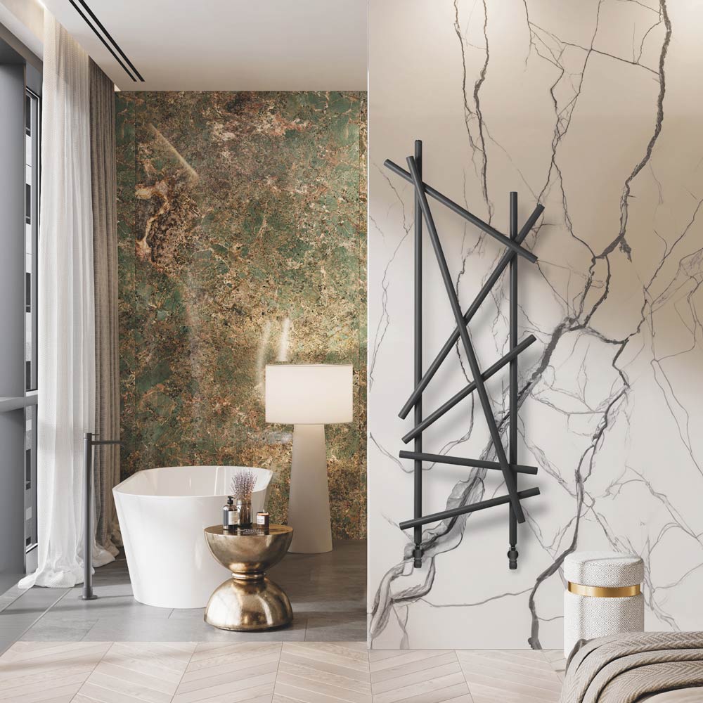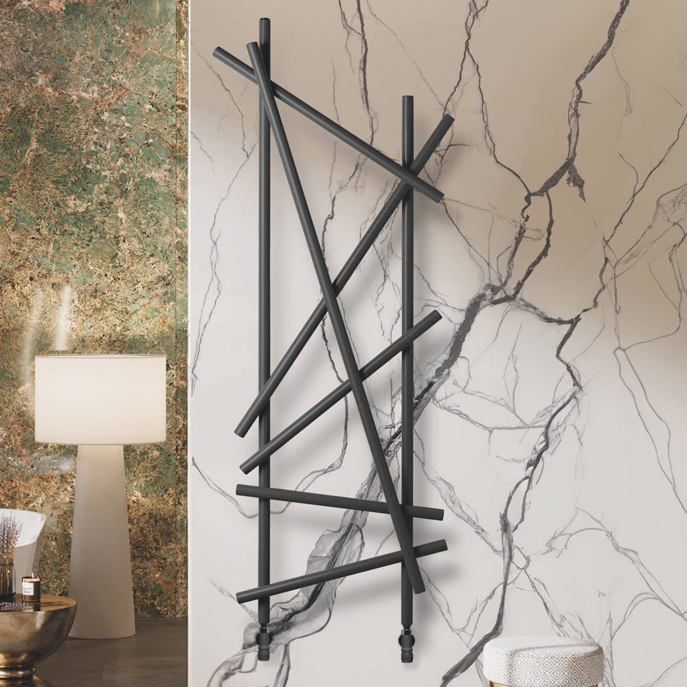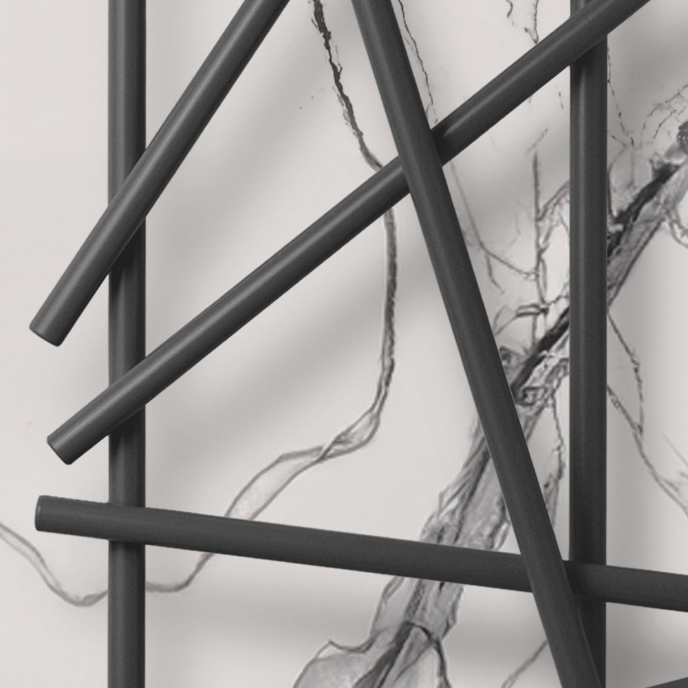 Ky radiator çeliku shquhet për dizajnin e tij inovativ dhe artistik, ideal për ata që kërkojnë një element funksional me një ndikim të fortë estetik për mjedisin e tyre. Linjat e parregullta dhe të kryqëzuara jo vetëm që maksimizojnë shpërndarjen e nxehtësisë, por gjithashtu e transformojnë ngrohësin në një vepër të vërtetë të artit të murit. Finitura e zezë mat jep një prekje moderniteti dhe klasi, duke u integruar në mënyrë perfekte me çdo skemë ngjyrash dhe dizajn të brendshëm, siç tregohet nga muret elegante të mermerit dhe thekset metalike të ambientit përreth.