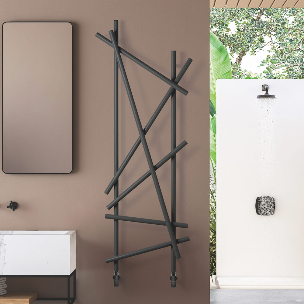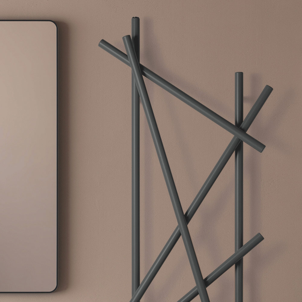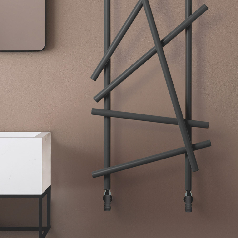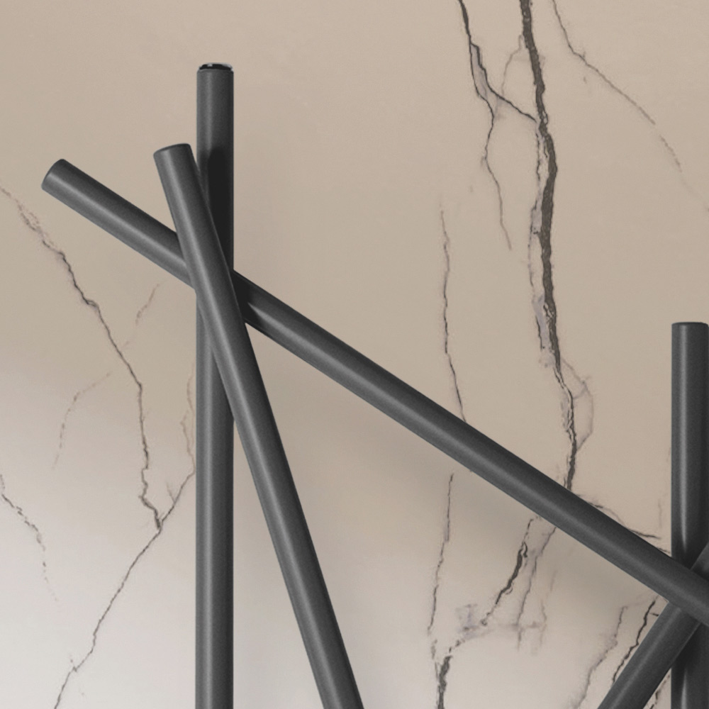 Ky radiator çeliku shquhet për dizajnin e tij inovativ dhe artistik, ideal për ata që kërkojnë një element funksional me një ndikim të fortë estetik për mjedisin e tyre. Linjat e parregullta dhe të kryqëzuara jo vetëm që maksimizojnë shpërndarjen e nxehtësisë, por gjithashtu e transformojnë ngrohësin në një vepër të vërtetë të artit të murit. Finitura e zezë mat jep një prekje moderniteti dhe klasi, duke u integruar në mënyrë perfekte me çdo skemë ngjyrash dhe dizajn të brendshëm, siç tregohet nga muret elegante të mermerit dhe thekset metalike të ambientit përreth.