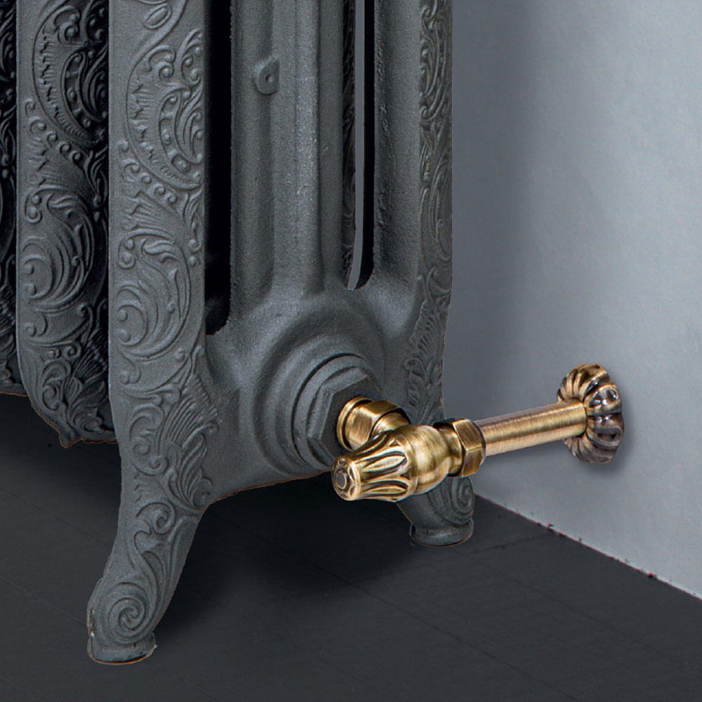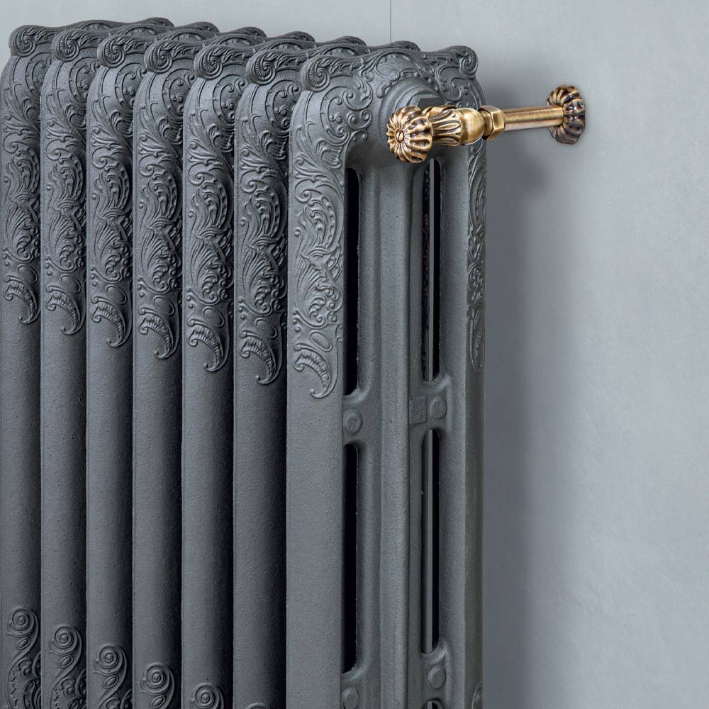 Radiator hidraulik prej gize me finiturë gri prej gize i përbërë nga 3 kolona me dizajn tradicional artistiknga fundi i viteve 1800/fillimi i viteve 1900, tërësisht i prodhuar në Itali me valvul frymëmarrjeje dhe kapak të verbër të përfshirë .