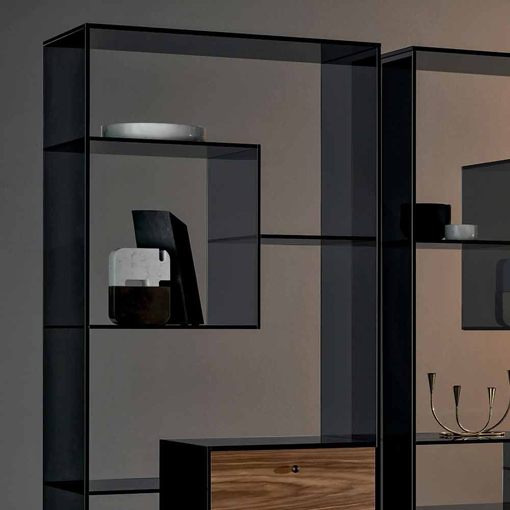 Kjo raft librash me ekran karakterizohet nga dizajni i saj i vendosur dhe elegant i bërë tërësisht nga xhami i tymosur.