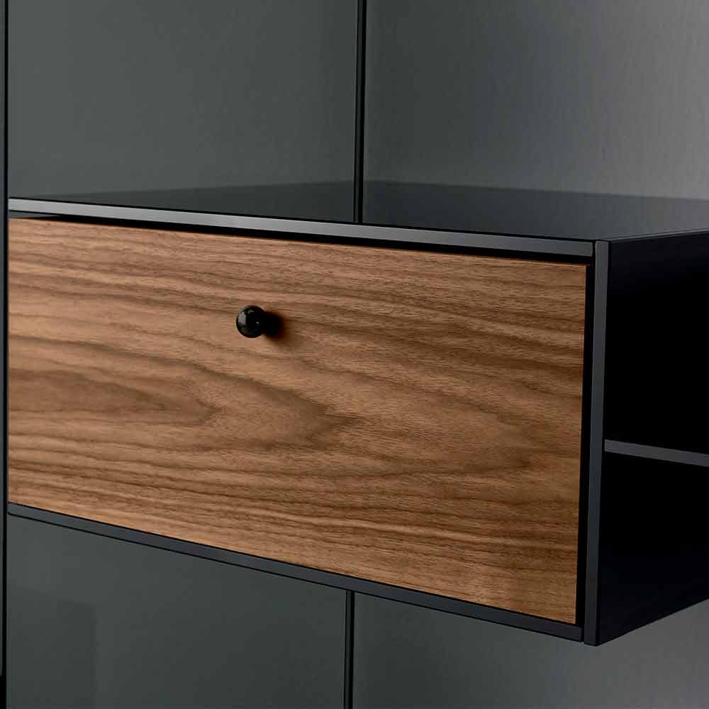 Përfshihet një sirtar në dru arre kanaleti me një çelës të përfundimit të gunës, i cili mund të pozicionohet sipas dëshirës në dy ndarjet e referencës. Ngarkesa e lejuar për secilën raft është 15 kg.