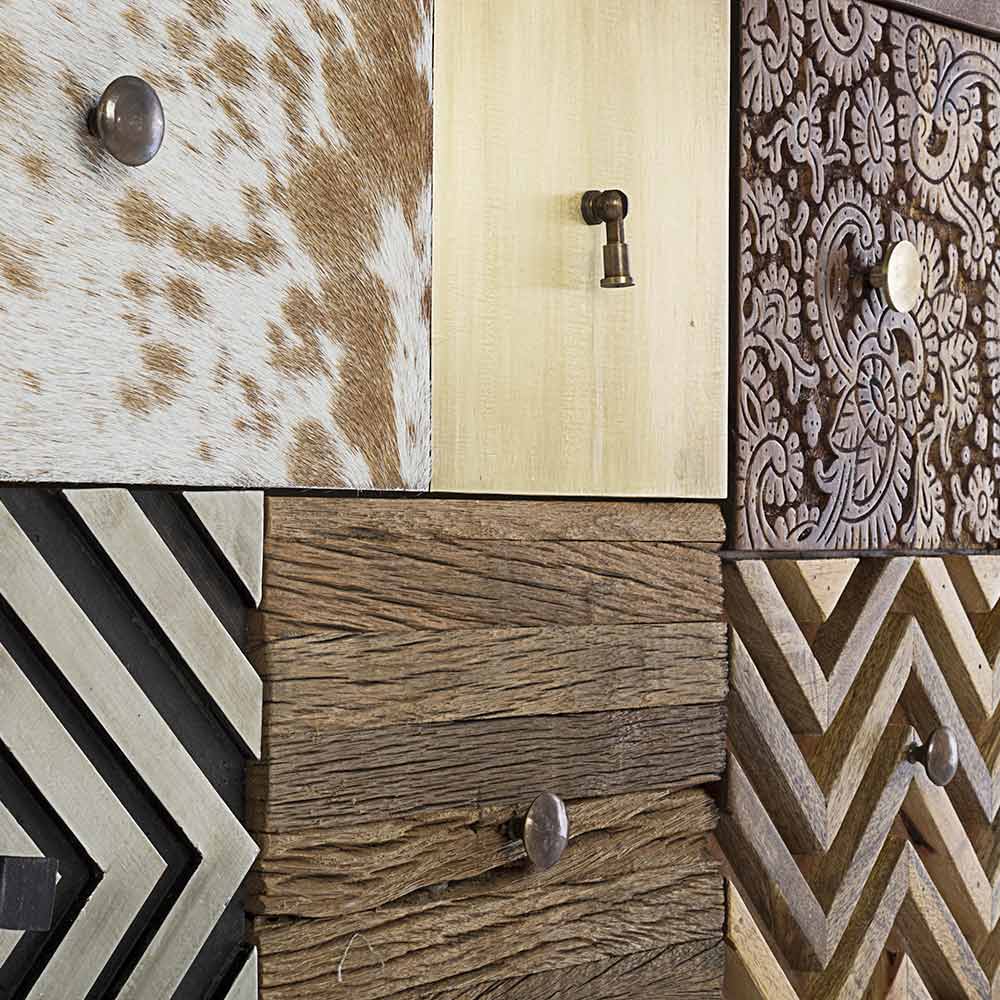 Pjesa e përparme e dyerve është prej druri të ricikluar mango dhe akacie me bojë me bazë uji.