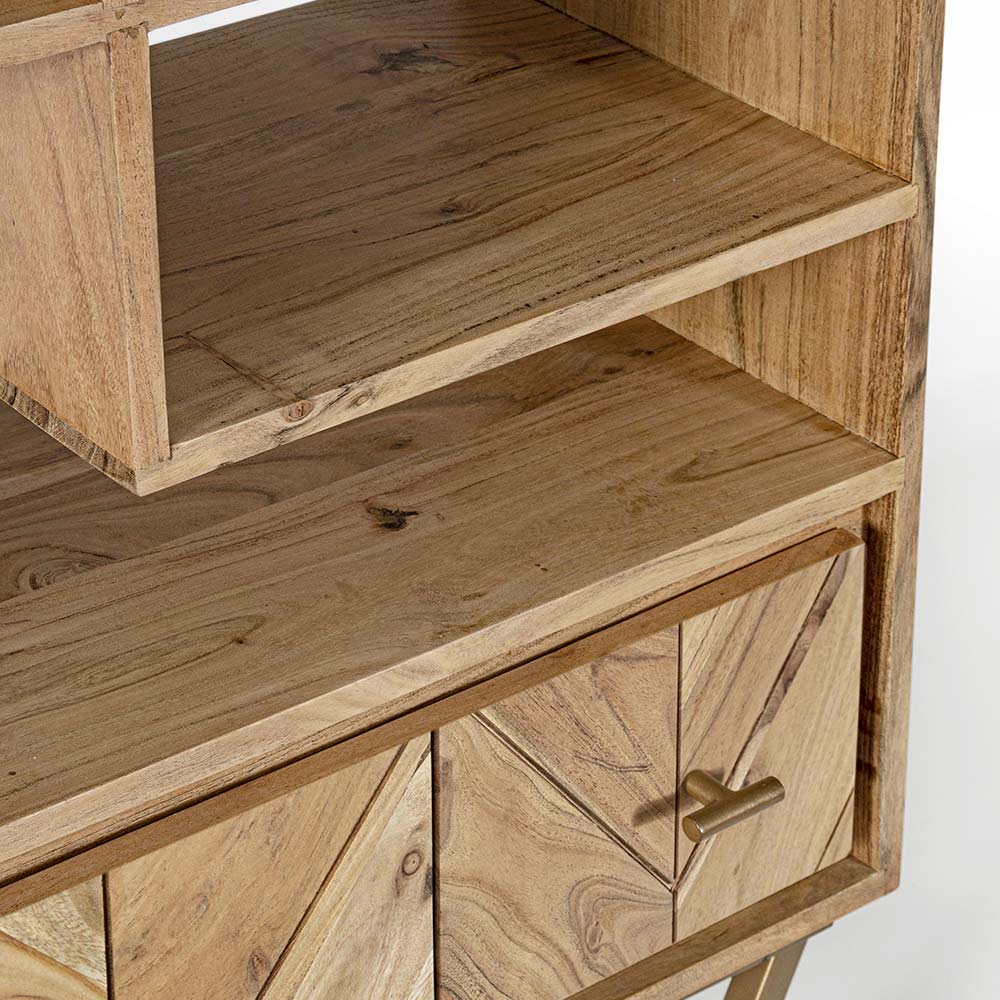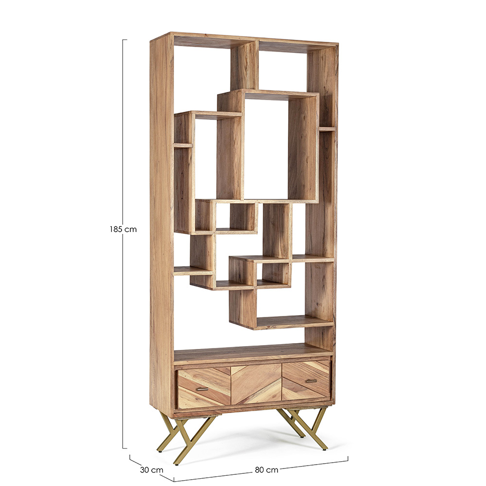 Ky raft librash i dhomës së ndenjes ka një strukturë druri akacie me kompensatë në pjesën e pasme dhe në brendësi të sirtarëve, përfundimi i bazuar në llak poliuretani. Këmbët në çelik të veshur me pluhur epoksid për t'u montuar.