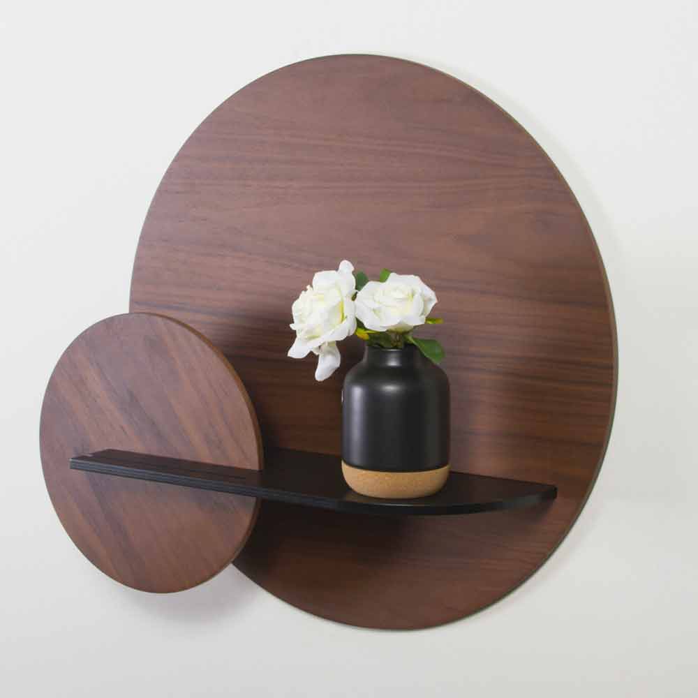 Ky raft përbëhet nga 3 panele kompensatë , njëra prej të cilave në fund të hirit me njolla të zeza të fiksuara në mur me një mbështetëse metalike që vepron si një sipërfaqe e vërtetë mbështetëse dhe dy panele të tjera të rrumbullakëta të montuara vertikalisht të bëra në fund të arrës , të cilat mund të pozicionohen në 8 konfigurime të ndryshme duke lejuar marrjen e një produkti të personalizueshëm sipas shijeve dhe nevojave. Në mënyrë që të rritet më tej funksionaliteti i këtij artikulli të mrekullueshëm, ekziston një vrimë praktike kablli e pozicionuar prapa panelit vertikal më të vogël, ideale për të fshehur çdo lloj kablli ose ngarkuesi. Ky objekt dizajni është padyshim një ide origjinale dhe inovative që falë stilit të tij minimal dhe linjave gjeometrike të kombinuara me materialet cilësore të përdorura dhe përfundimet i japin jetë një produkti elegant dhe të gjithanshëm, i aftë të revolucionarizojë atmosferën e çdo dhome. me një shije bashkëkohore. Pastrohet shpejt dhe lehtë duke përdorur një leckë të thjeshtë të lagur.