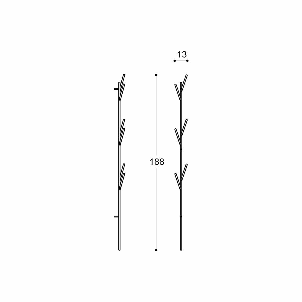 Raft pallto i stilizuar në pemë i bërë nga metali i pikturuar. "Degët" e saj, të rregulluara rastësisht, veprojnë si një varëse peshqiri ose bathrobe.