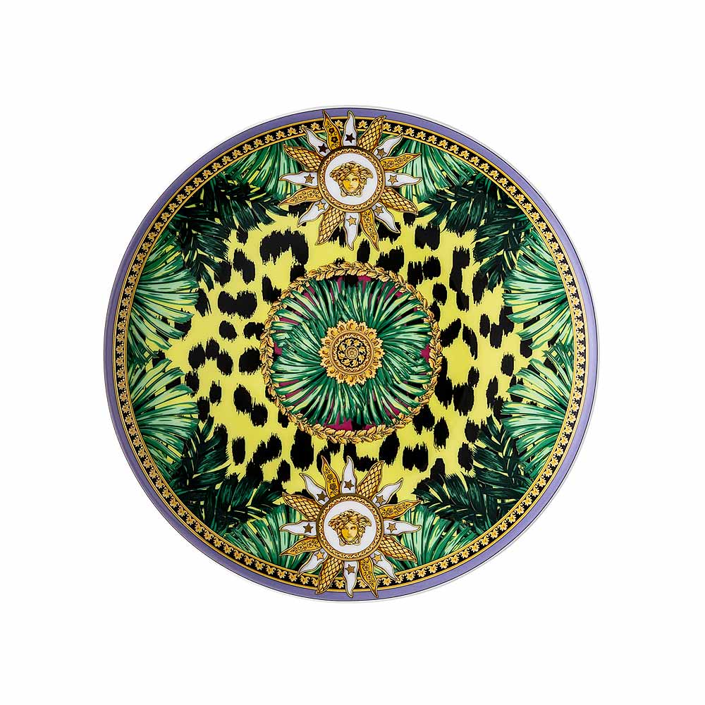 Pjata e bukës Versace Jungle Animalier , e punuar nga porcelani i imët , është një shpërthim vitaliteti dhe luksi ekzotik . Dizajni i tij i guximshëm përmban një sfond të gjallë të zbukuruar me motive gjethesh tropikale dhe detaje më shtazarake, të gjitha të përmirësuara nga simboli ikonik Medusa i vendosur në një diell të artë, një simbol i energjisë dhe fuqisë.
