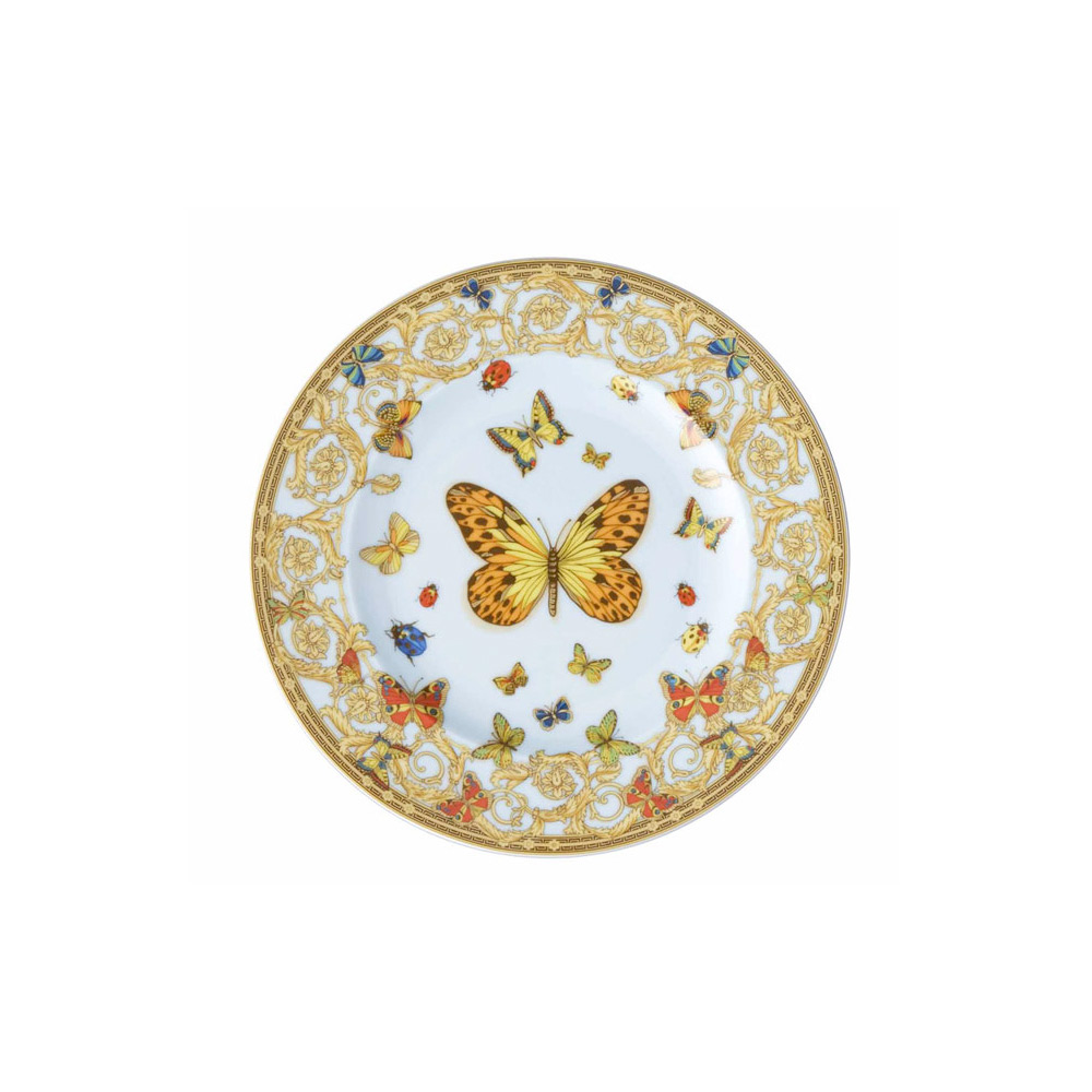Kjo pjatë simpatike prej porcelani përmban një dizajn të ndritshëm dhe shumëngjyrësh që tërheq menjëherë vëmendjen, duke e bërë atë një artikull koleksionist, si dhe një enë tavoline të rafinuar. Një flutur elegante bie në sy në qendër, e rrethuar nga një kufi dekorativ delikat me motive lulesh dhe arabeska.