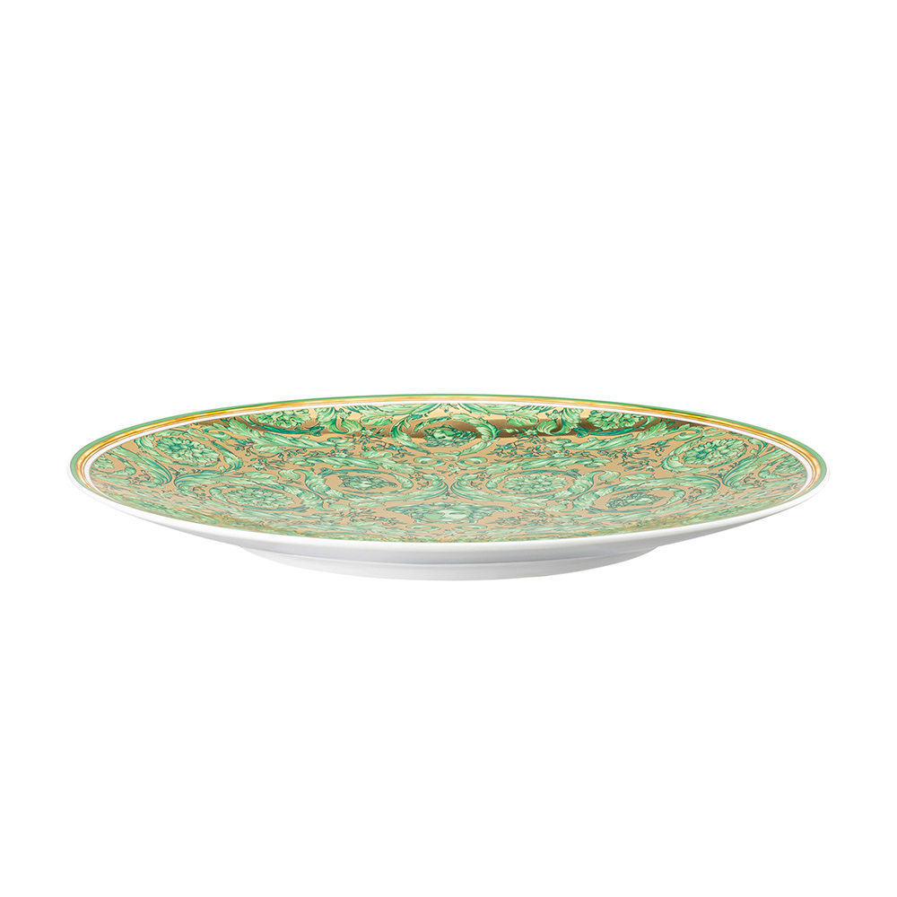 Tonet e gjelbra smerald dhe motivet e ndërthurura barok krijojnë një atmosferë luksoze dhe mikpritëse, duke e shndërruar tryezën tuaj në një skenë ëndrrash. E përkryer për të shtuar një prekje magjepsëse dhe sofistikimi në darkat tuaja të Krishtlindjeve, është një objekt që ndërthur traditën dhe modernitetin me stilin unik të Versace.