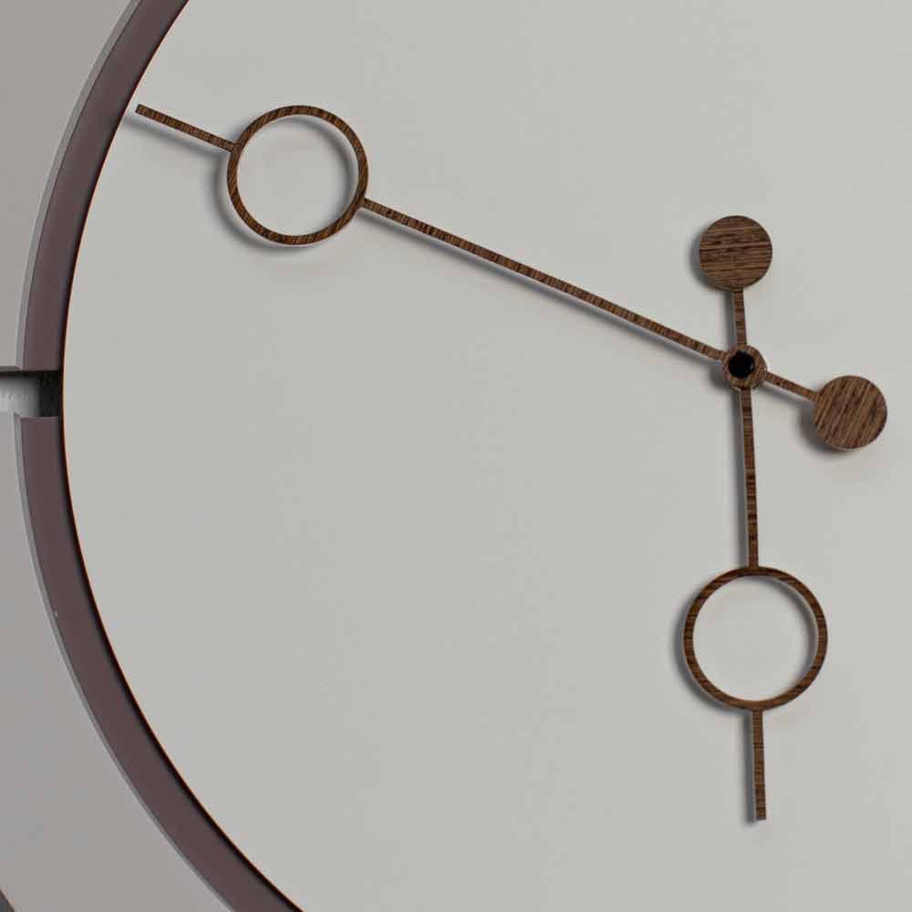 Ora e rrumbullakët krijohet falë kombinimit të tre nuancave kafe: rërë, bezhë dhe kakao, me duar arre. Do pjesë është vendosur në një tjetër për të formuar një orë unike , përmes një kombinimi të menduar mirë të ngjyrave dhe formave.