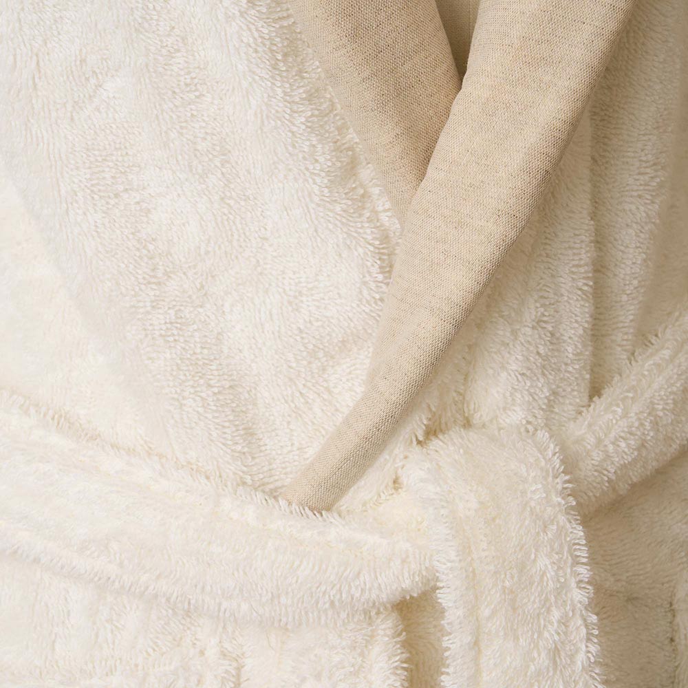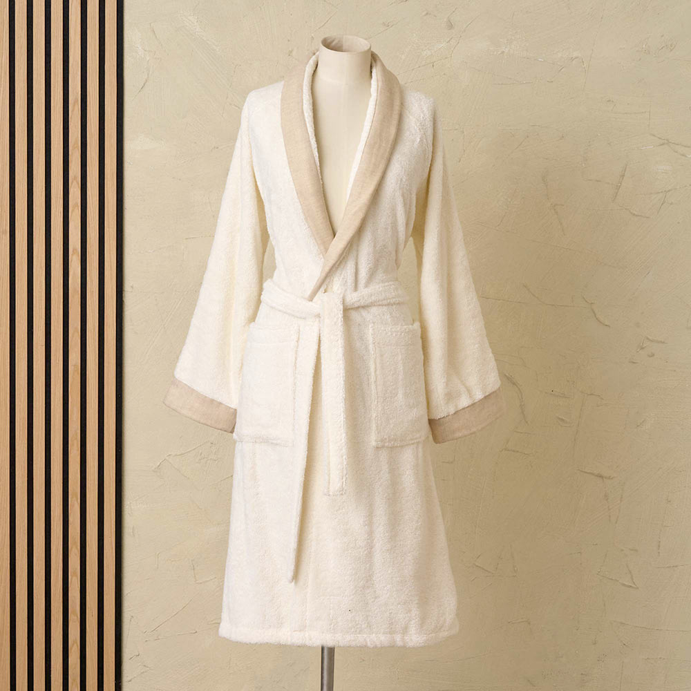 Detaji që e bën këtë rroba banjoje vërtet të veçantë është tufa e pastër prej liri , e cila jo vetëm shton një element dekorativ delikat, por edhe një kontrast teksture që thekson mjeshtërinë dhe cilësinë e lartë të produktit. Kombinimi i pambukut dhe lirit jo vetëm që garanton qëndrueshmëri dhe rezistencë, por edhe rehati të jashtëzakonshme, me absorbueshmëri superiore që ju lë të thatë dhe të mbështjellë me ëmbëlsi të pastër.