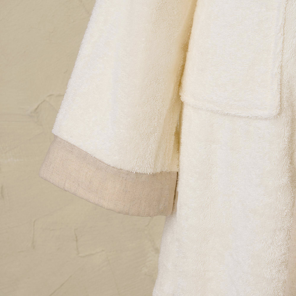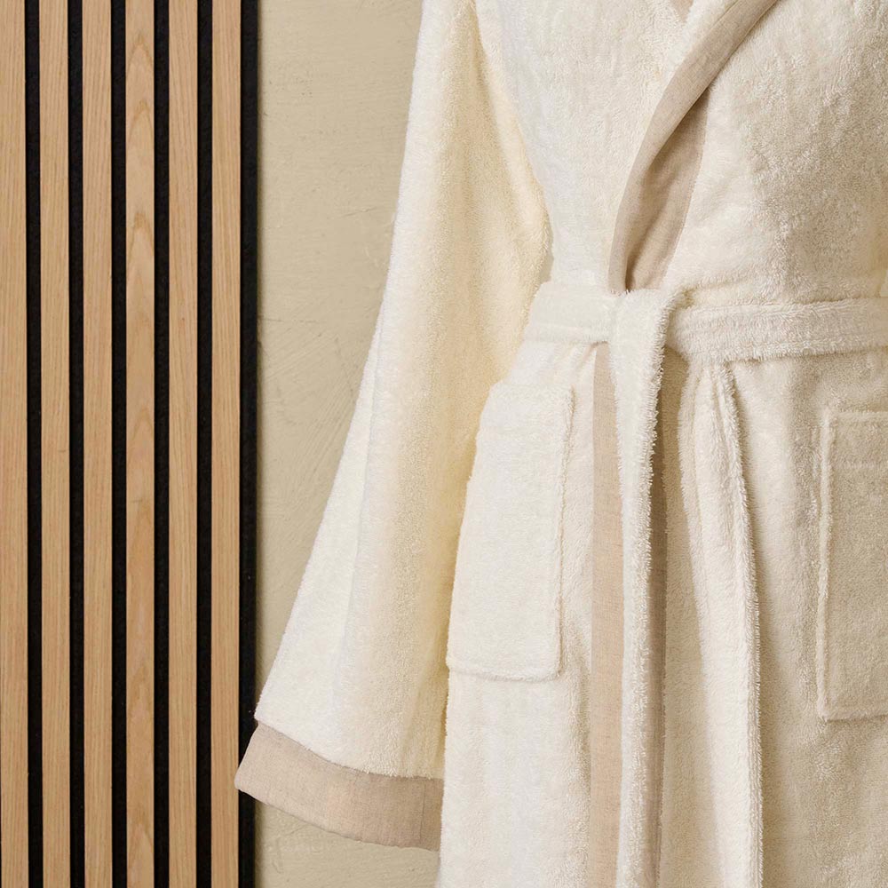 Kjo banjo pambuku e pastër me kapuç është mishërimi i rehatisë dhe sofistikimit. Ngjyra elegante dhe e gjithanshme e fildishtë , kjo rroba banjo është e përkryer për ata që kërkojnë një veshje komode dhe elegante për t'u veshur pas banjës ose gjatë momenteve të relaksimit në shtëpi.