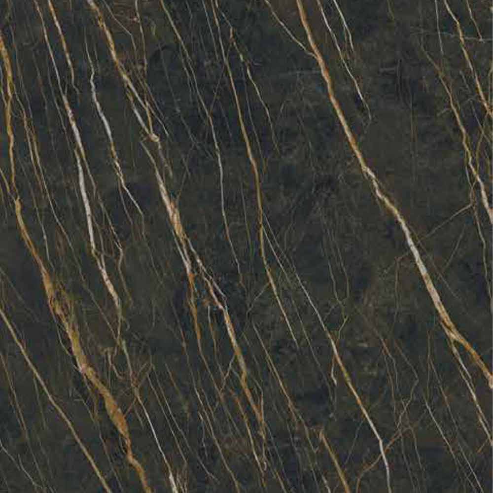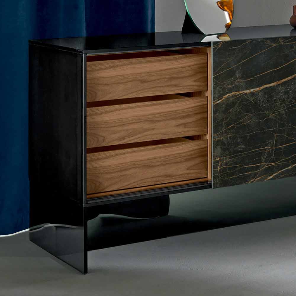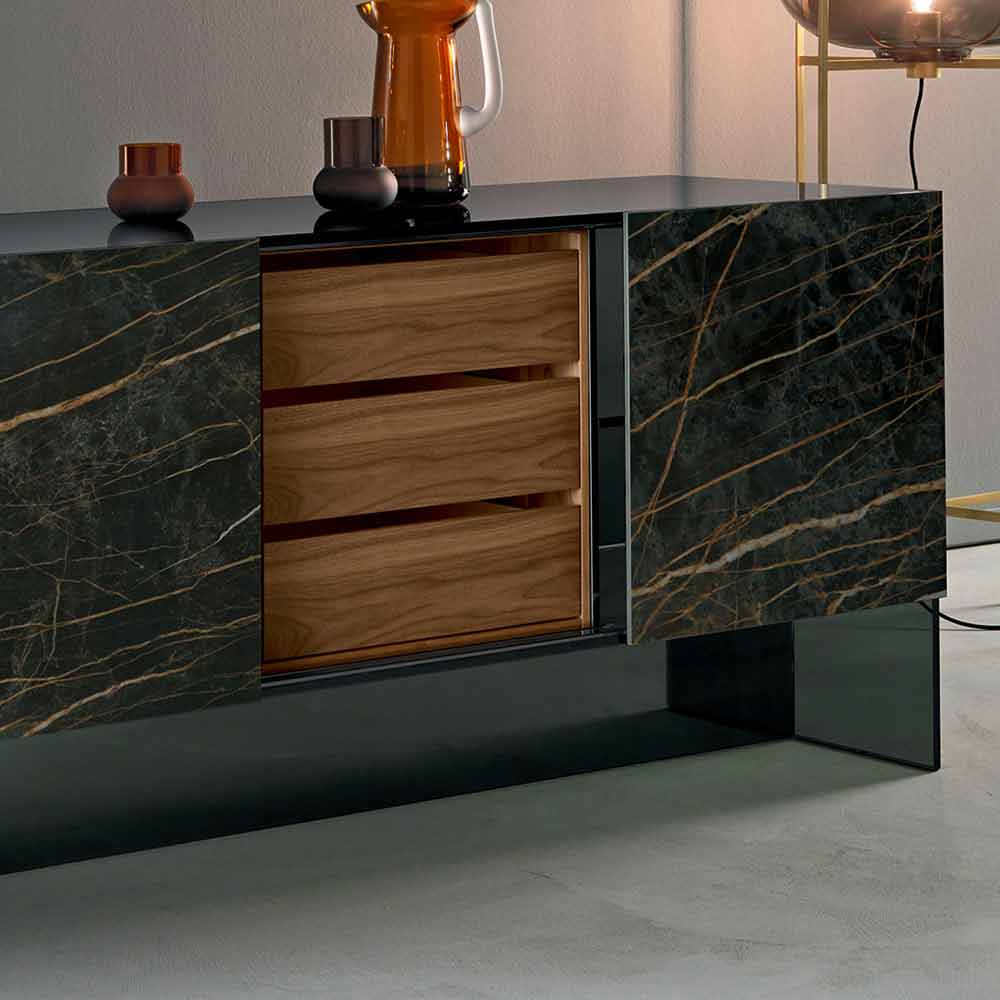 Salloni anësor i dhomës së ndenjes me një strukturë qelqi smokey dhe dy dyer të ndritshme qeramike Noir Desir, realizuar me dorë në Itali.