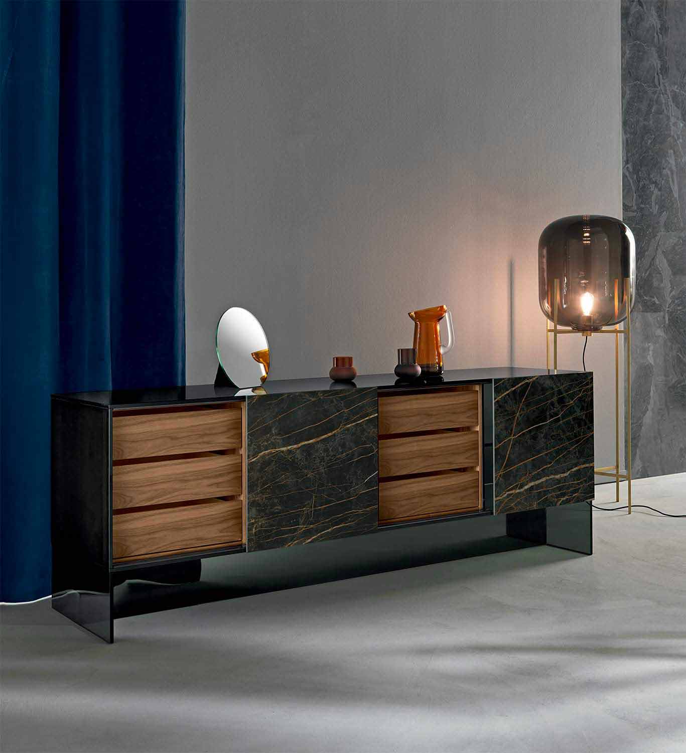 Skoca e dhomës së ndenjes Scocca realizohet me dorë në Itali me materiale me cilësi të lartë. Isshtë e përbërë nga një strukturë në xhami smokey dhe dy dyer rrëshqitëse me shkëlqim Noir Desir . Për një funksionalitet më të lartë, Scocca ka në brendësi edhe dy sirtarë kanellë me rimeso .