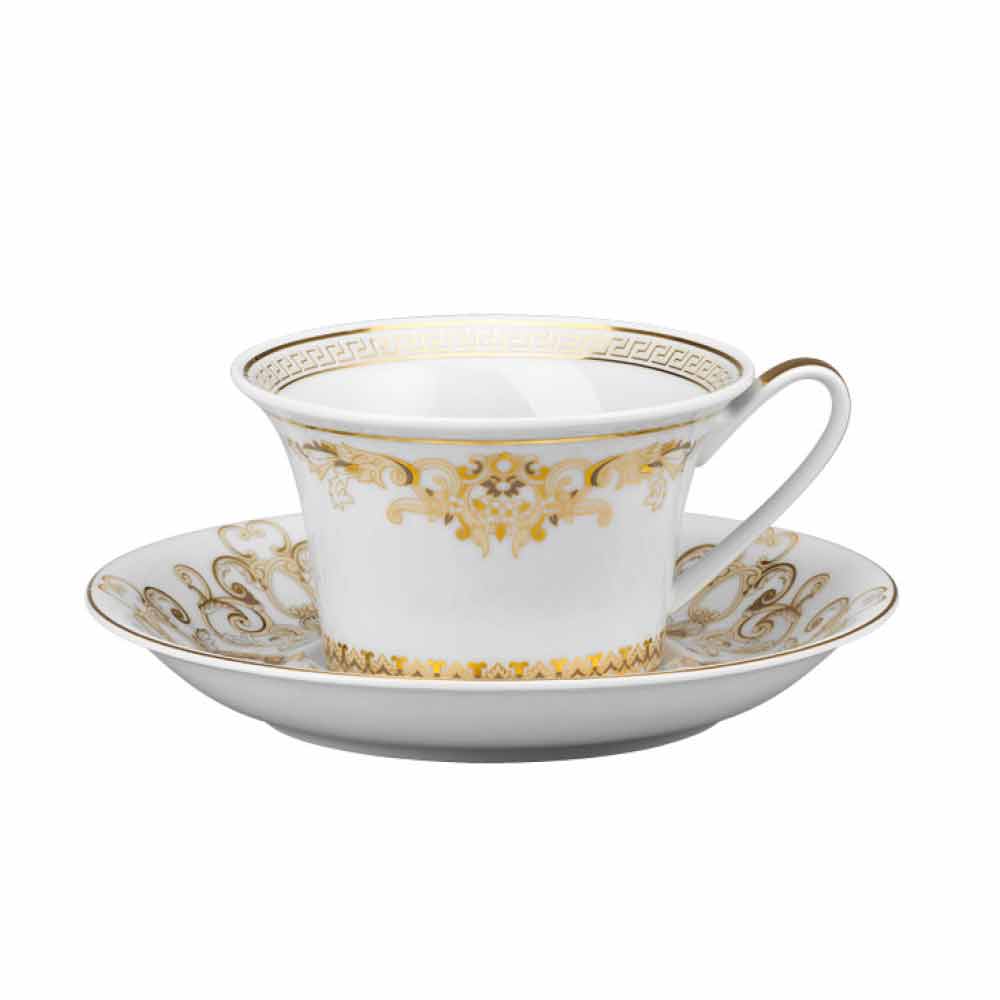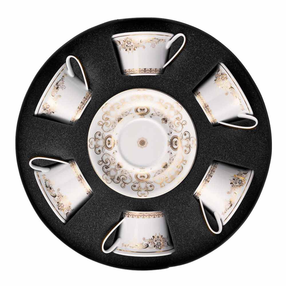 Set filxhani çaji prej porcelani Versace Medusa Gala me 6 pjesë Ky grup prej 6 filxhanësh çaji përmban të gjithë sqimën dhe luksin e koleksionit të ri të enëve të tavolinës Medusa Gala , i cili riinterpreton motivet tradicionale Versace në dizajnin dhe dekorimin e tij: ikona që përshkruan Medusa alternohet me ornamente të rafinuara barok në një filigran të çmuar. ari. Një efekt kontrasti emocionues midis bardhësisë së porcelanit dhe arit të pastër i jep jetë një mize të përsosur, moderne dhe në të njëjtën kohë unike. E pasuruar me motive dhe dekorime tërësisht në ar, Medusa Gala vjen edhe në versionin edhe më luksoz "Gold", perfekt për të integruar dhe zbukuruar më tej tryezën.